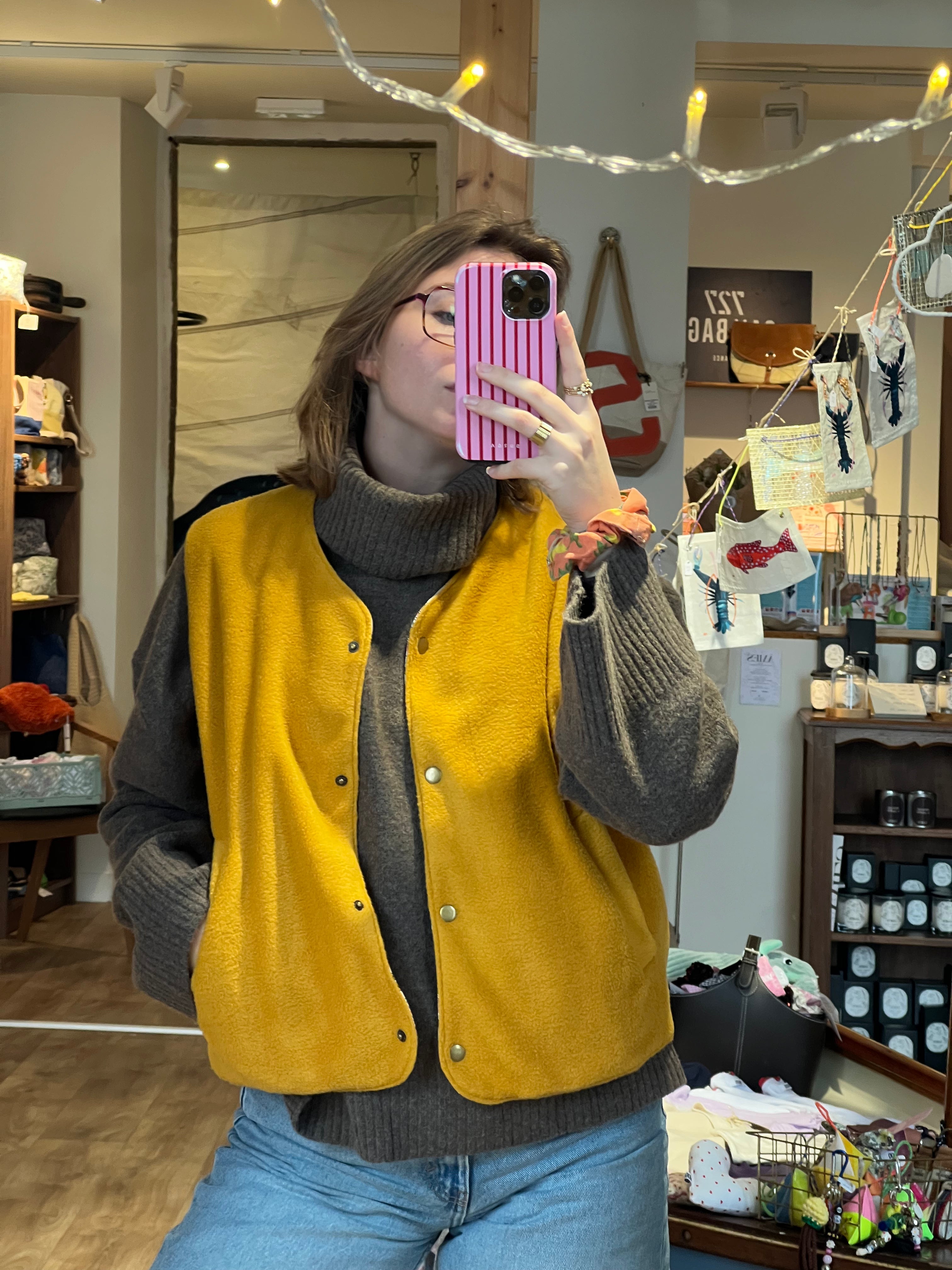 Plongez dans la douceur et le style avec le gilet Jaune signé Coud'vent , confectionné à la main à Lannilis, en Bretagne .