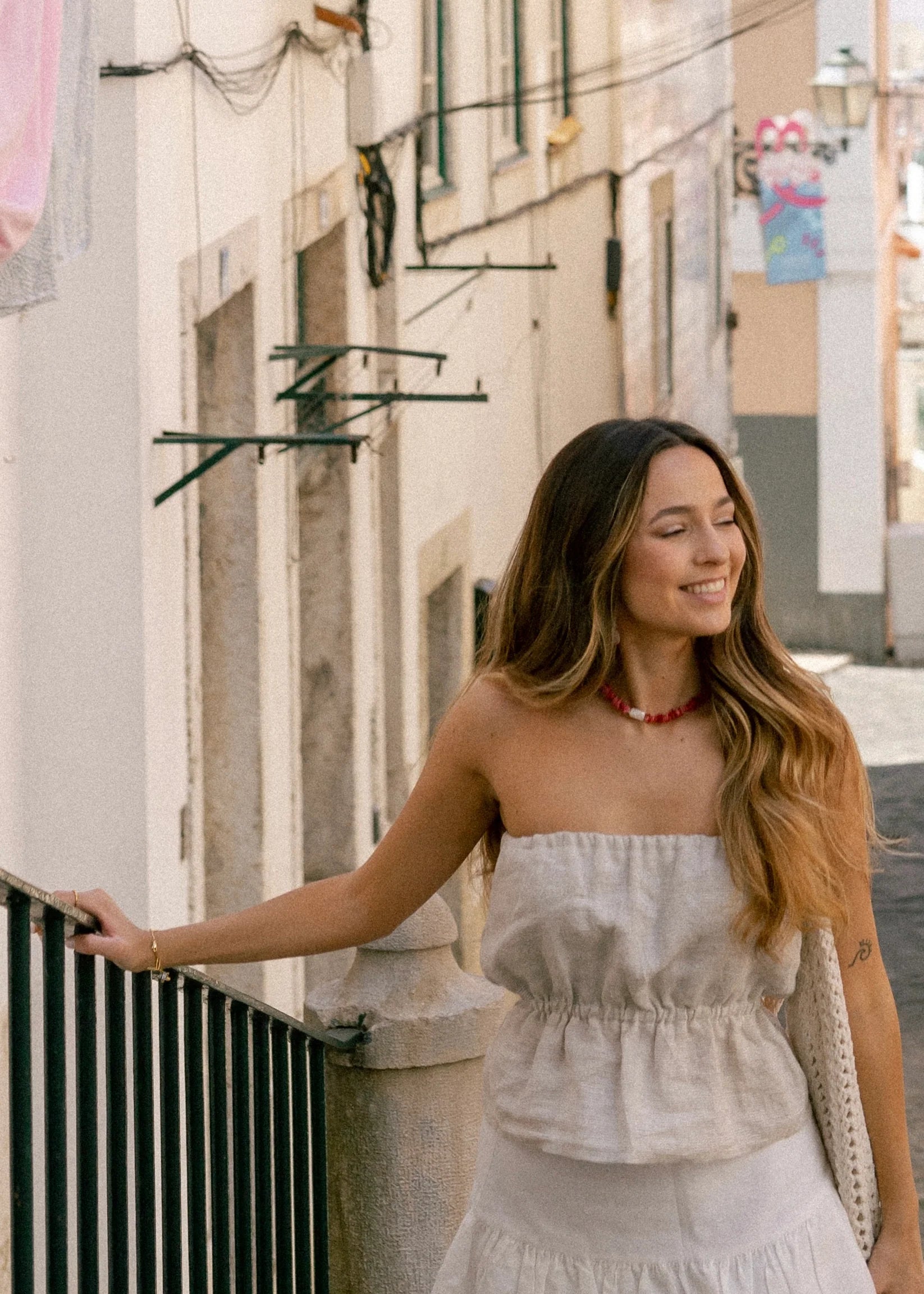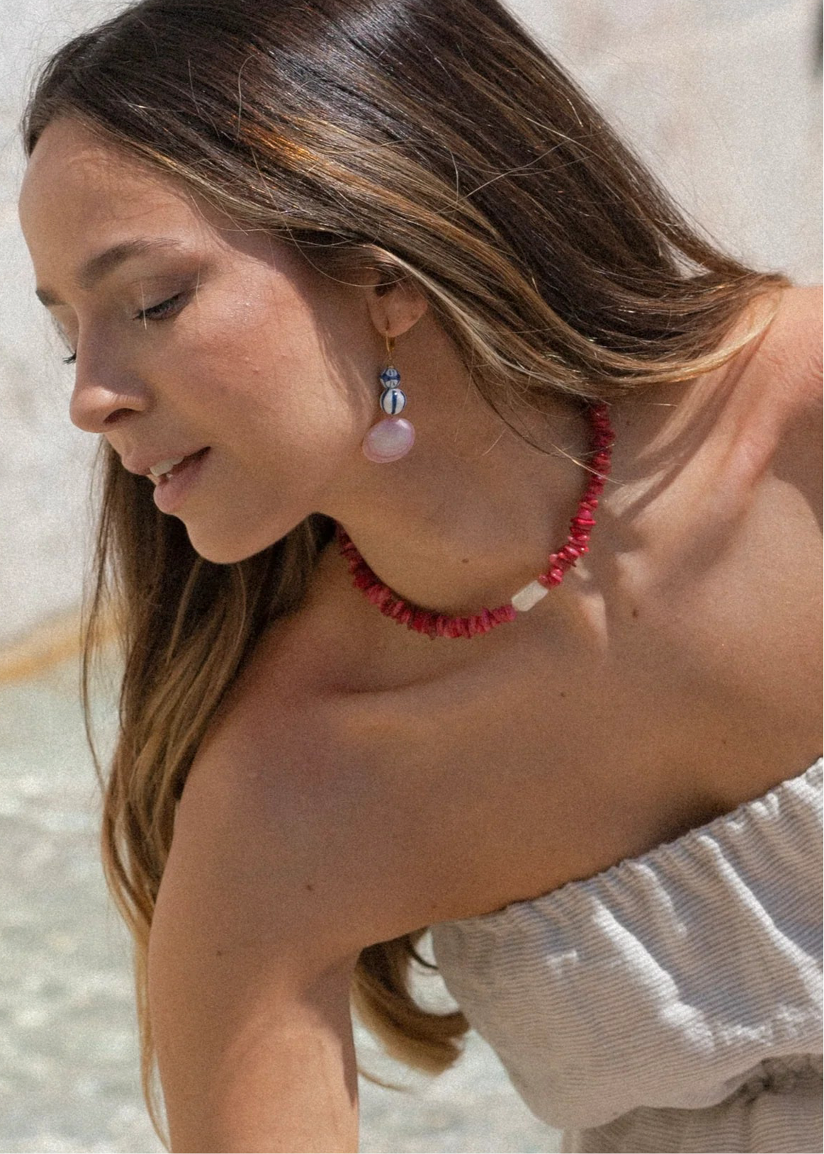 Le collier Anna est une ode à l’été et à la féminité. Composé de chips de coquillages naturels teintés en rose, il se distingue par sa perle d’eau douce nacrée au centre, qui capte la lumière et sublime le port de tête.