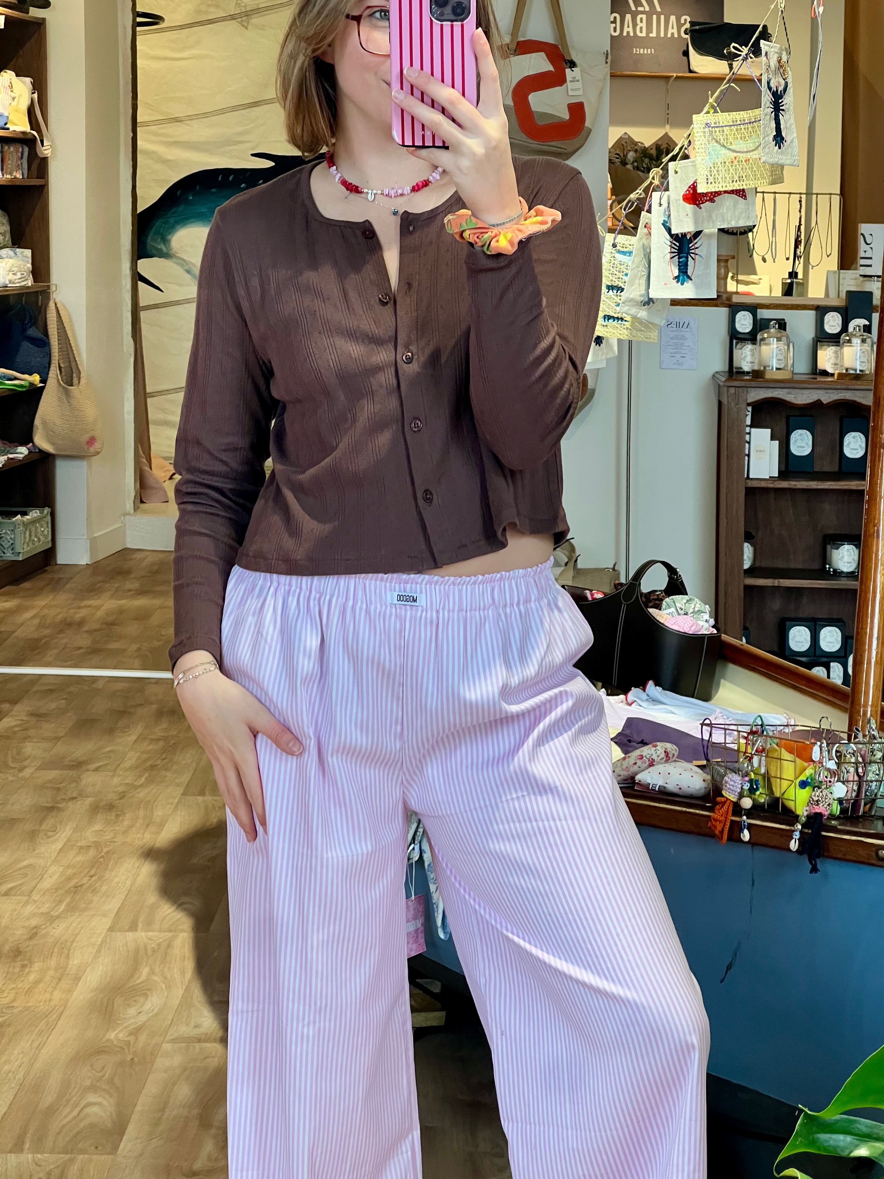 Le pantalon Chantal de la marque M0G000 est une pièce confortable et pleine de caractère, confectionnée à la main en Bretagne à partir de 100 % coton issu de stocks dormants d’usines françaises.
