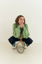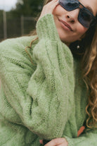 Pull à manches longues de couleur verte avec torsades sur le devant et sur les manches