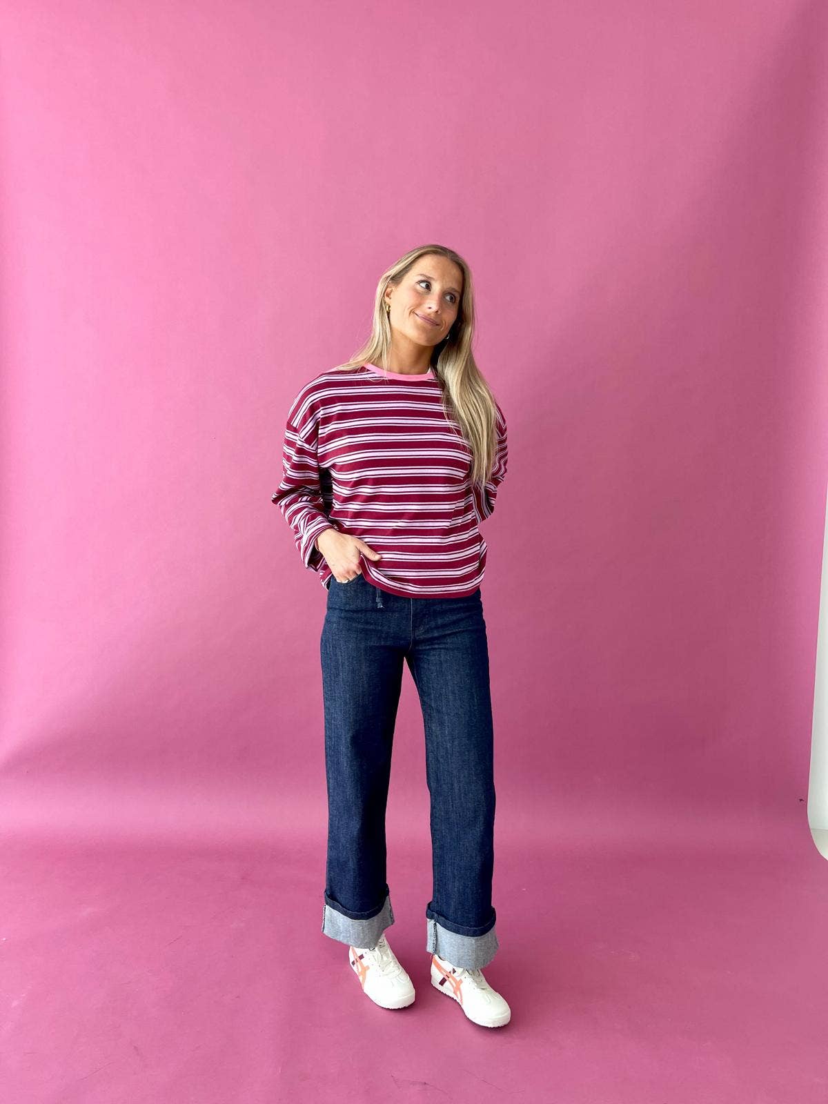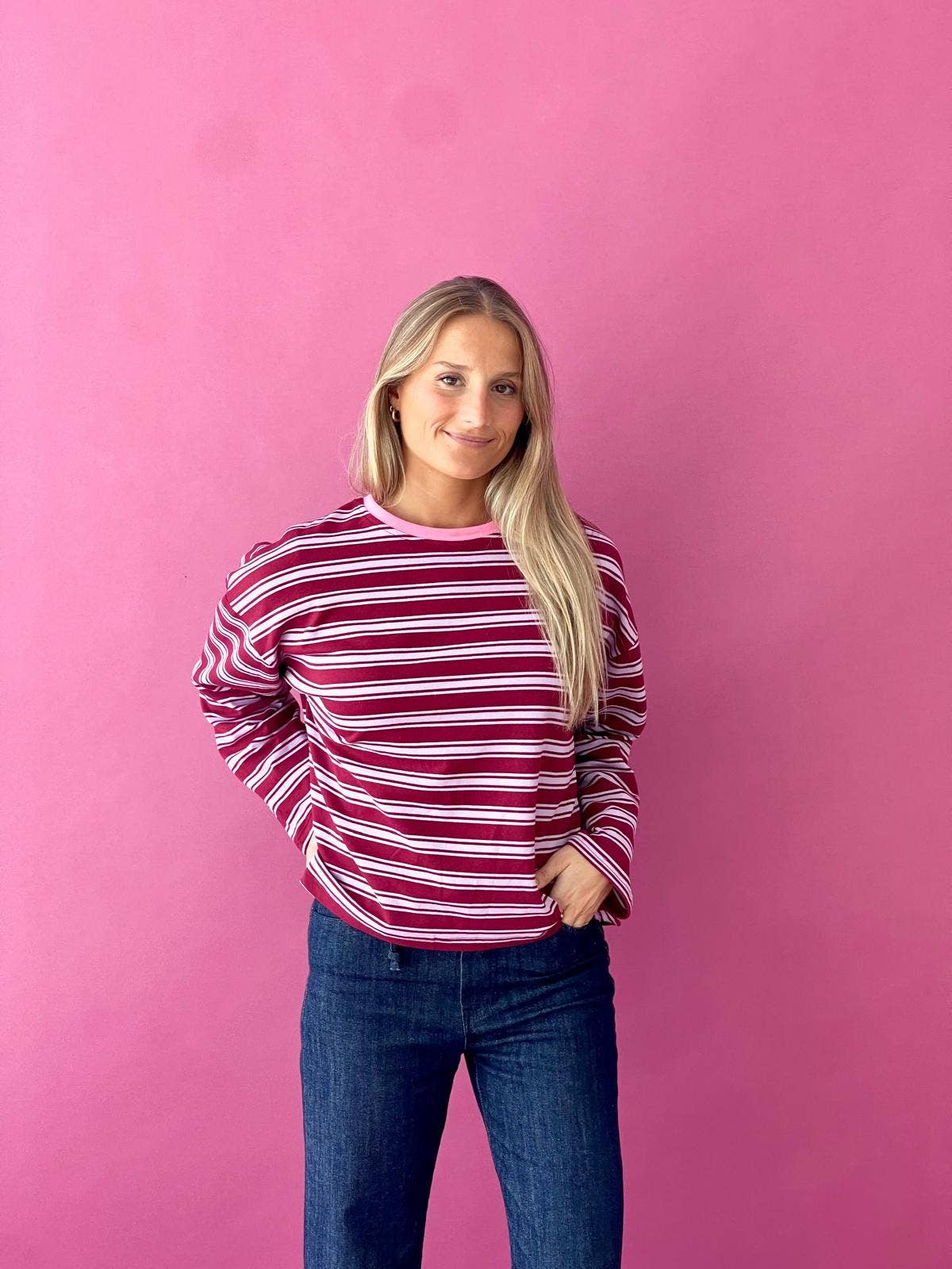 T-shirt à manches longues à rayures horizontales rose et bordeaux, sublimé par un col rose vibrant. Une pièce confortable et facile à associer, idéale pour le quotidien.