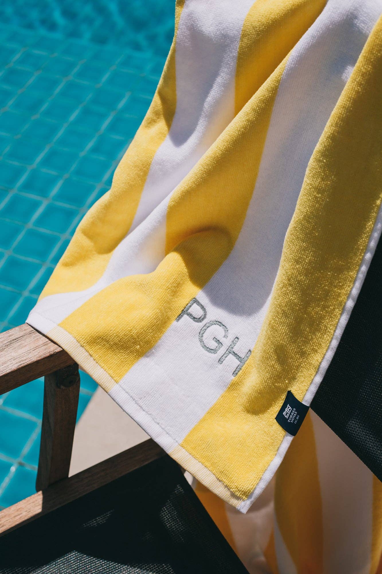 Inspirée du phare de Gibalta à Oeiras, cette serviette revisite le style balnéaire des années 1940 avec ses rayures verticales jaunes au charme vintage.