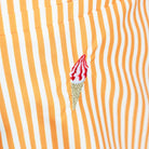 Short de bain homme en 100 % polyester recyclé, fabriqué à partir de déchets plastiques collectés en Méditerranée. Couleur orange éclatante, avec une broderie cornet de glace sur la poche arrière pour une touche originale.