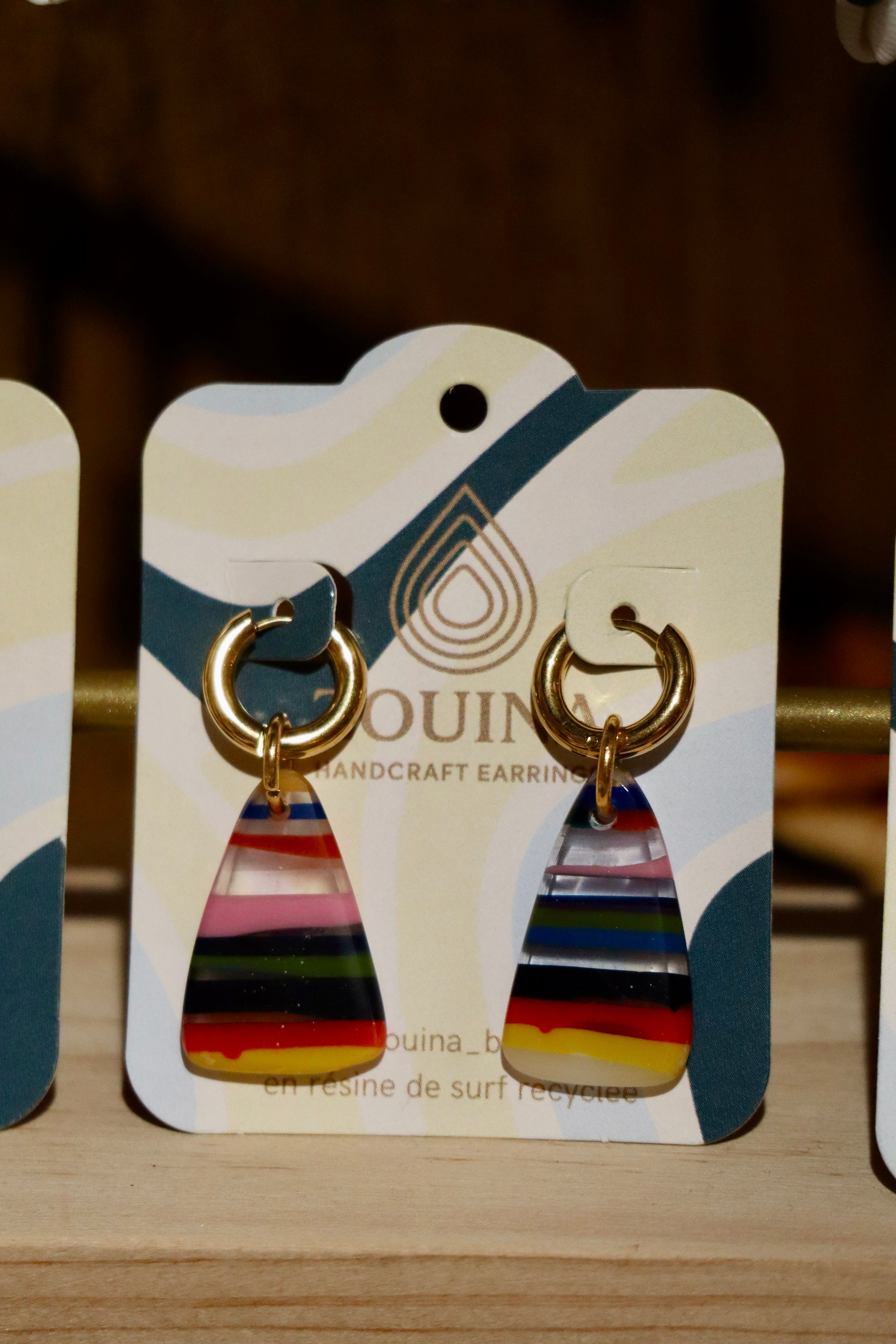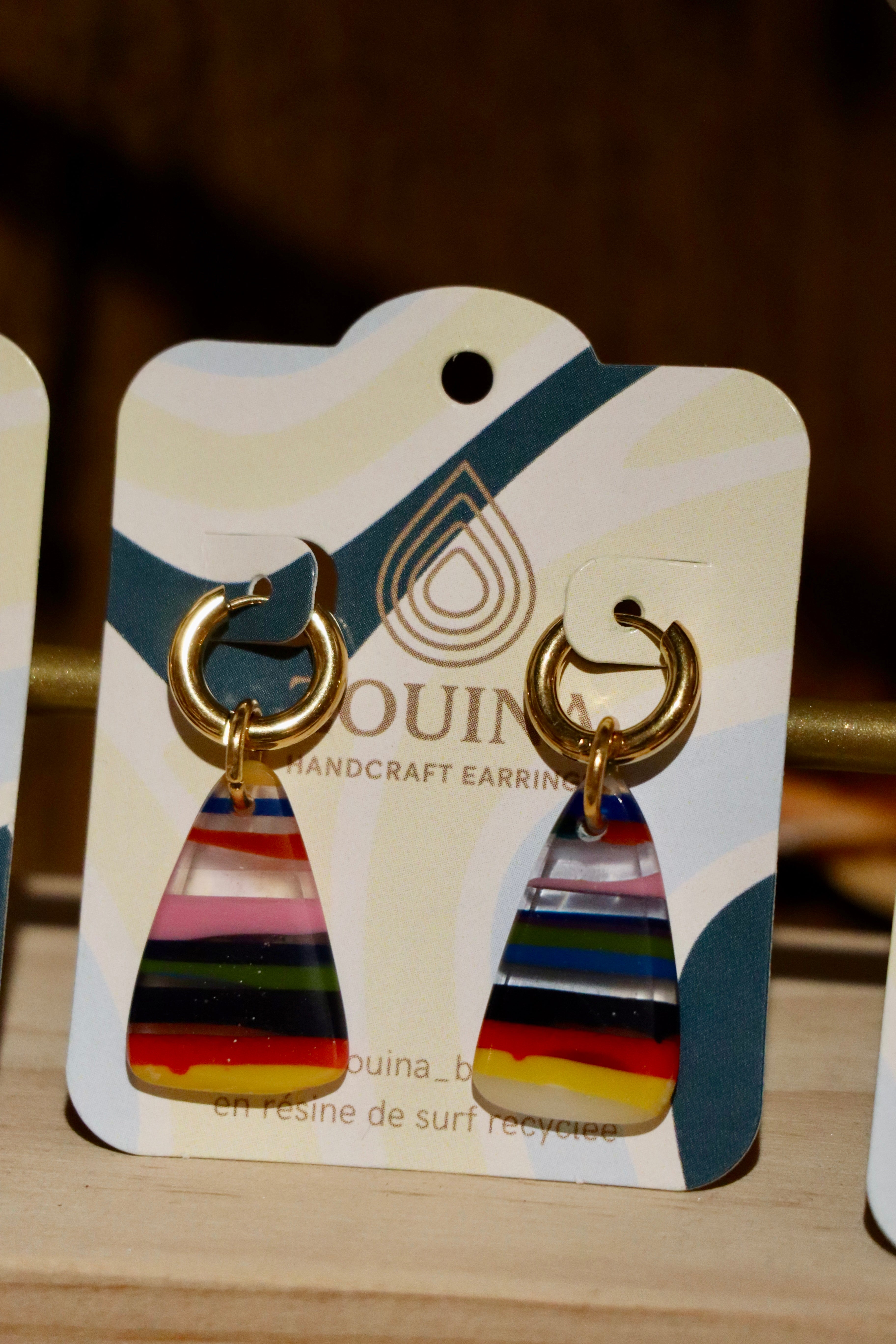 Chaque pièce est façonnée à la main, ce qui garantit des motifs et couleurs uniques. Légères, originales et produites en petite série, elles incarnent un choix engagé pour celles qui souhaitent porter un bijou artisanal, local et respectueux de l’environnement.