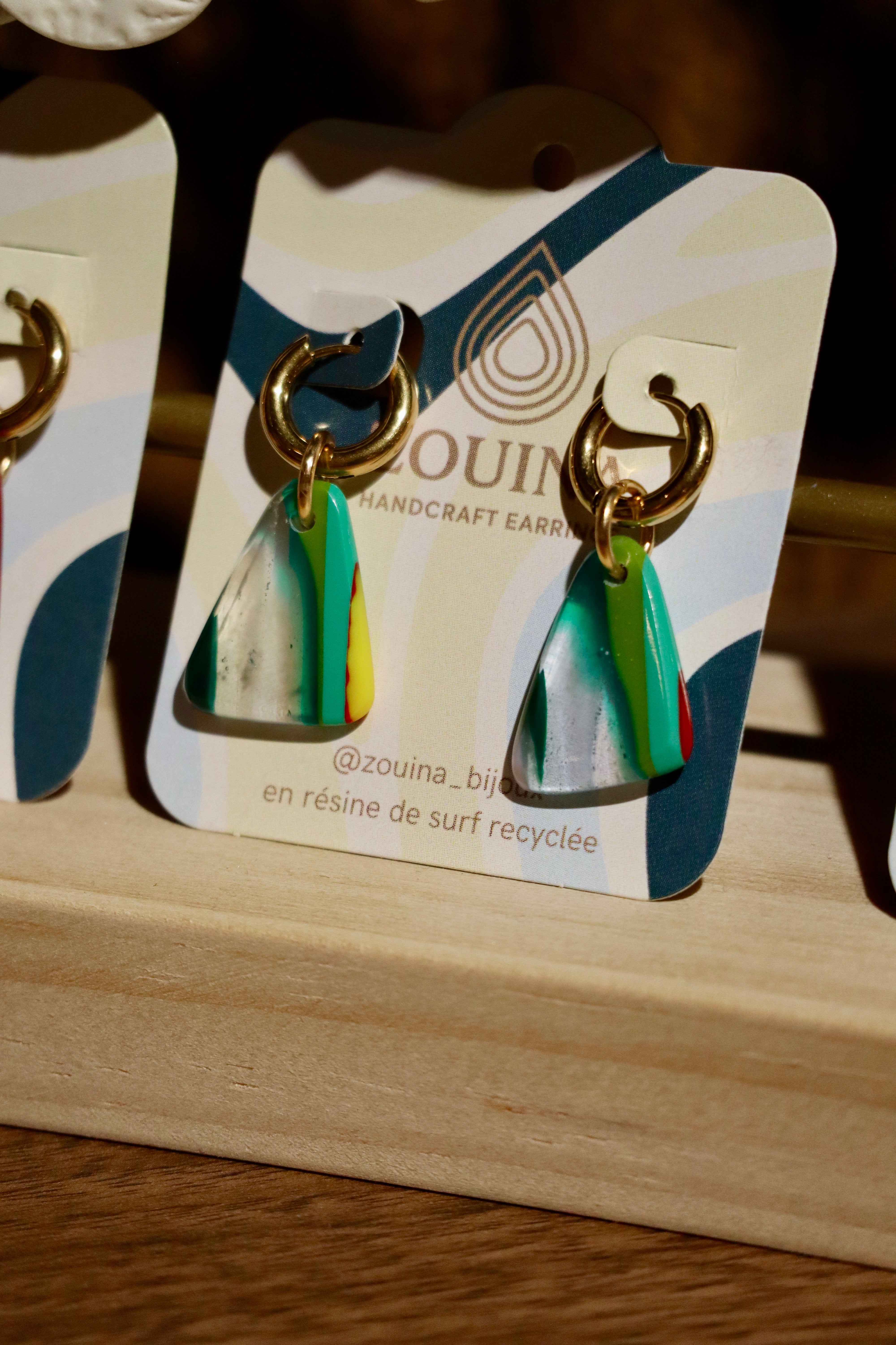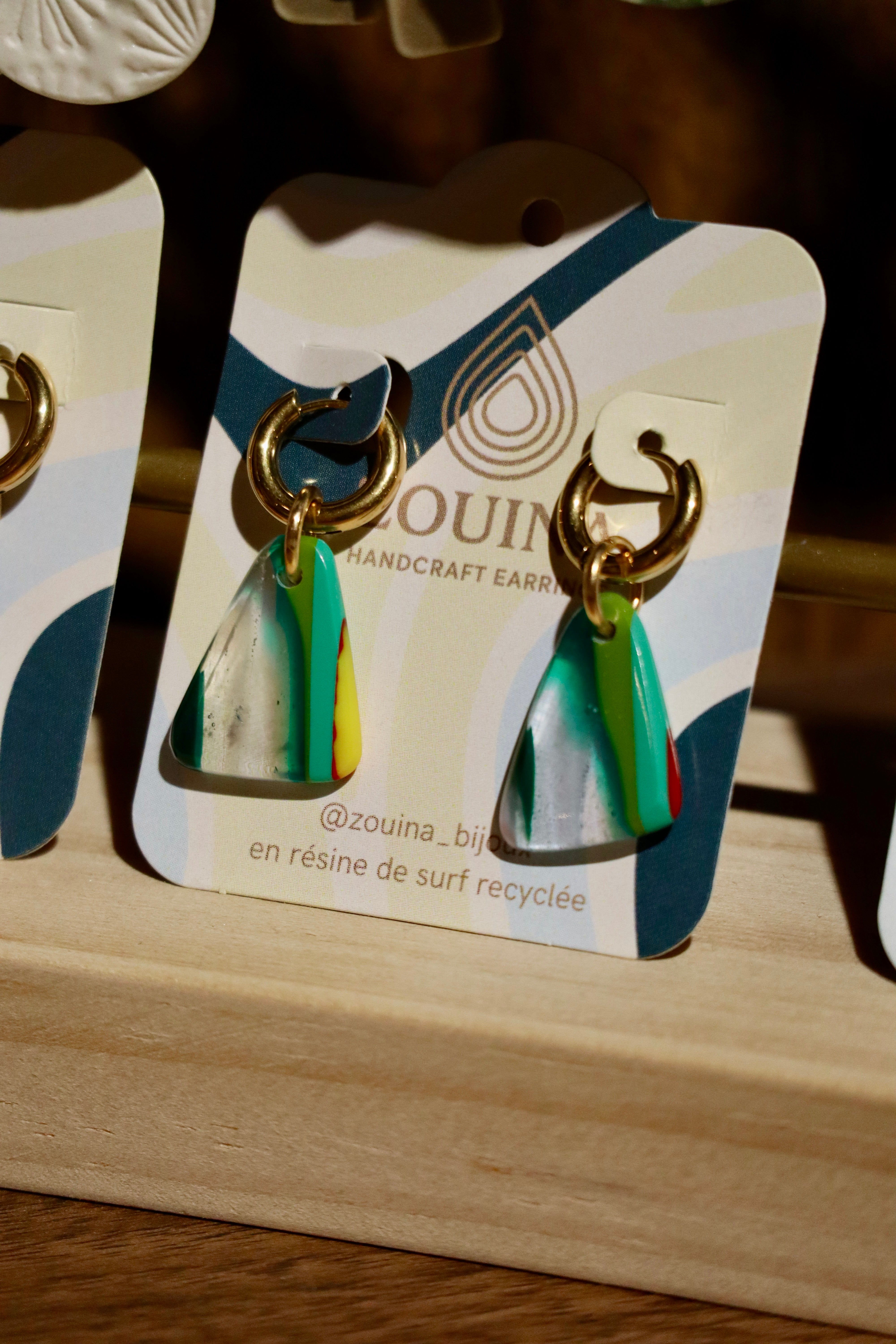 Les boucles d’oreilles Zouina sont fabriquées à partir de chutes de résine issues de la construction de planches de surf, soigneusement collectées puis transformées pour créer un bijou durable et responsable. Ce processus d’upcycling permet de valoriser un matériau considéré comme un déchet et de lui offrir une nouvelle vie.