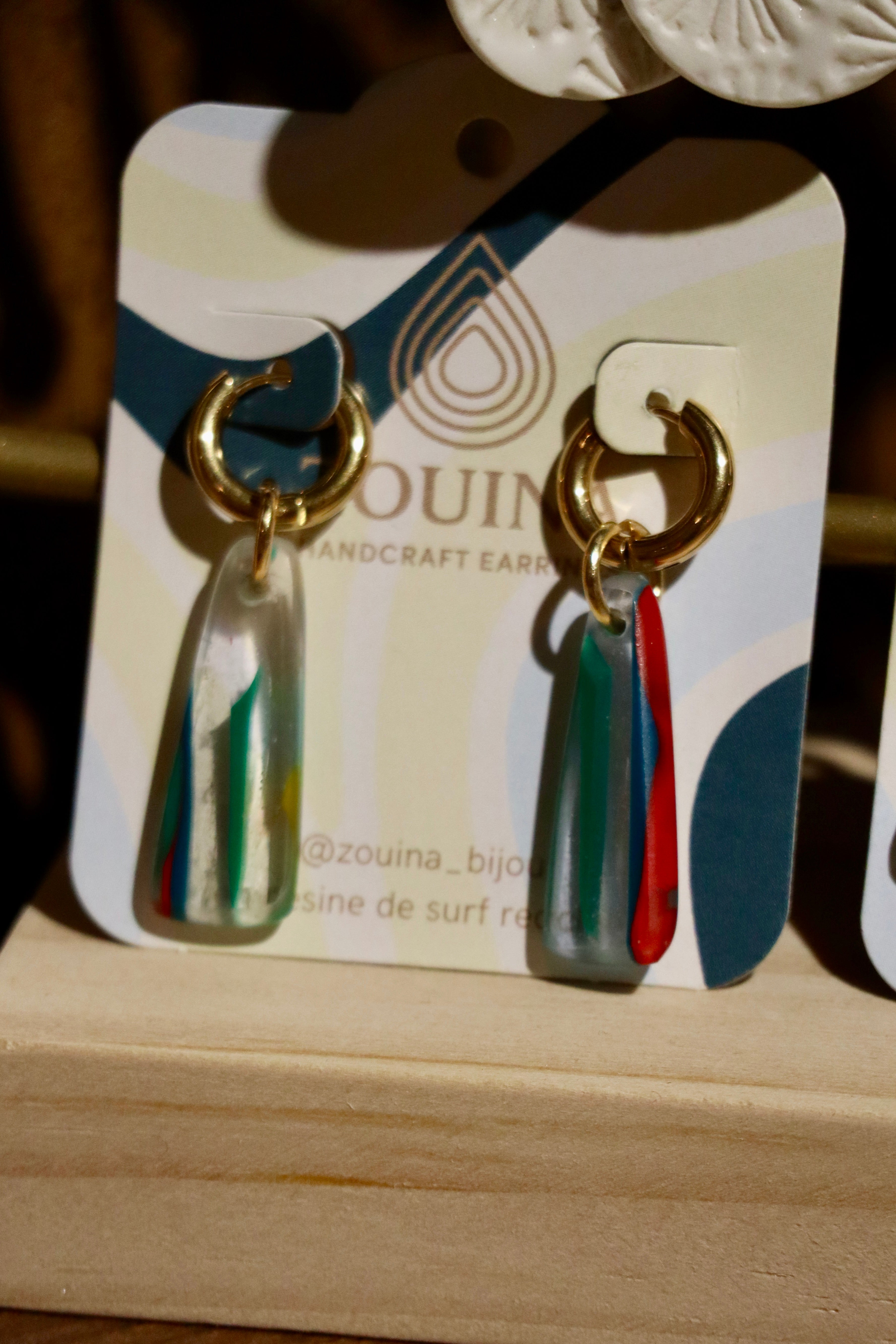Les boucles d’oreilles Zouina sont fabriquées à partir de chutes de résine issues de la construction de planches de surf, soigneusement collectées puis transformées pour créer un bijou durable et responsable. Ce processus d’upcycling permet de valoriser un matériau considéré comme un déchet et de lui offrir une nouvelle vie.