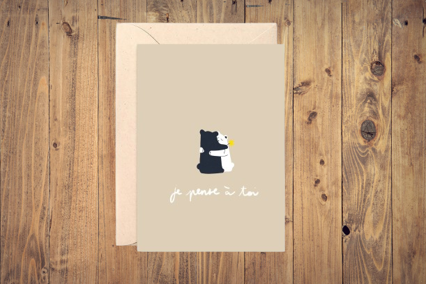 Cette carte pliée au format A6 (15 x 10,5 cm sans emballage ) est accompagnée d’une enveloppe en papier Kraft recyclé.