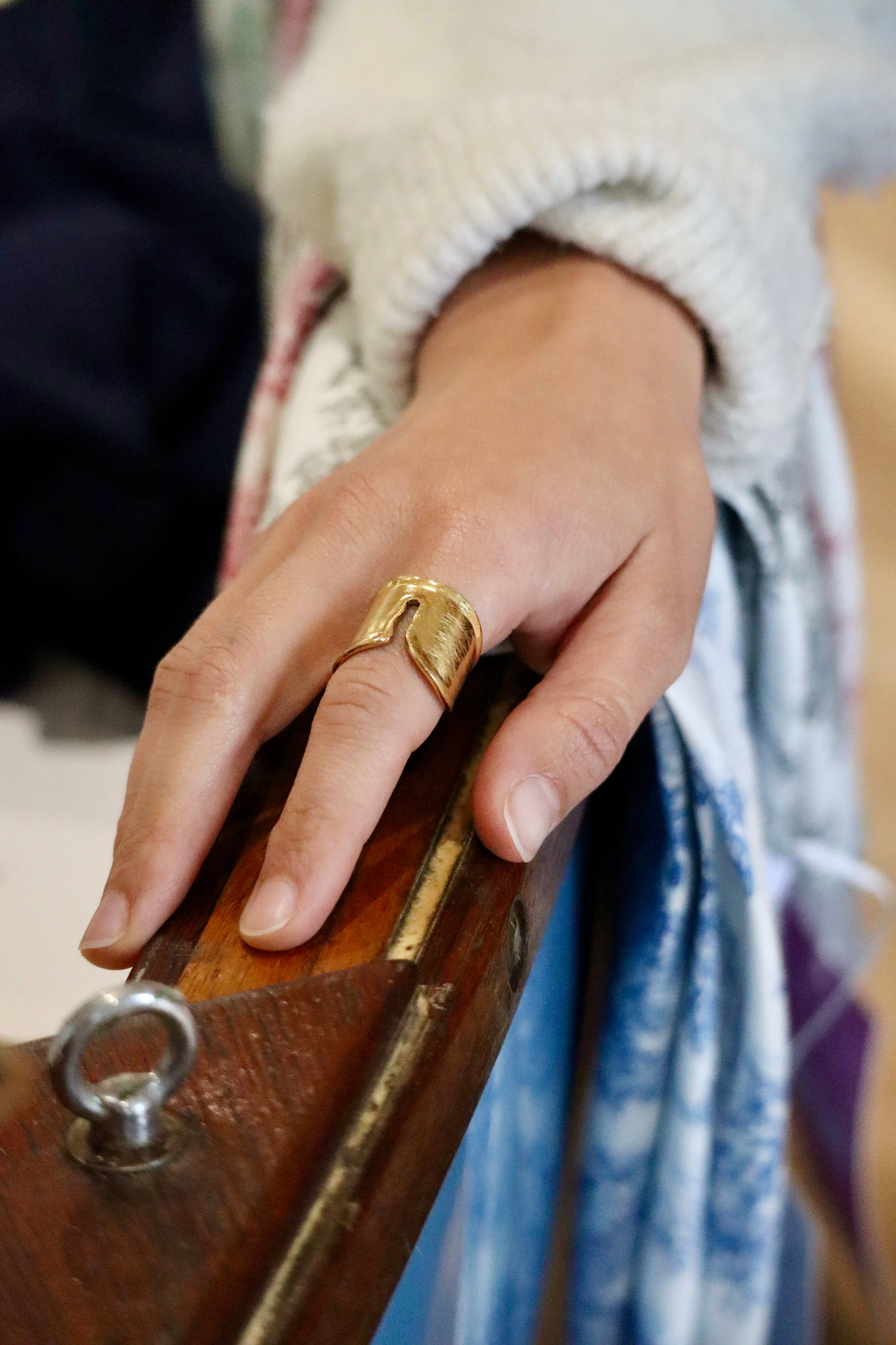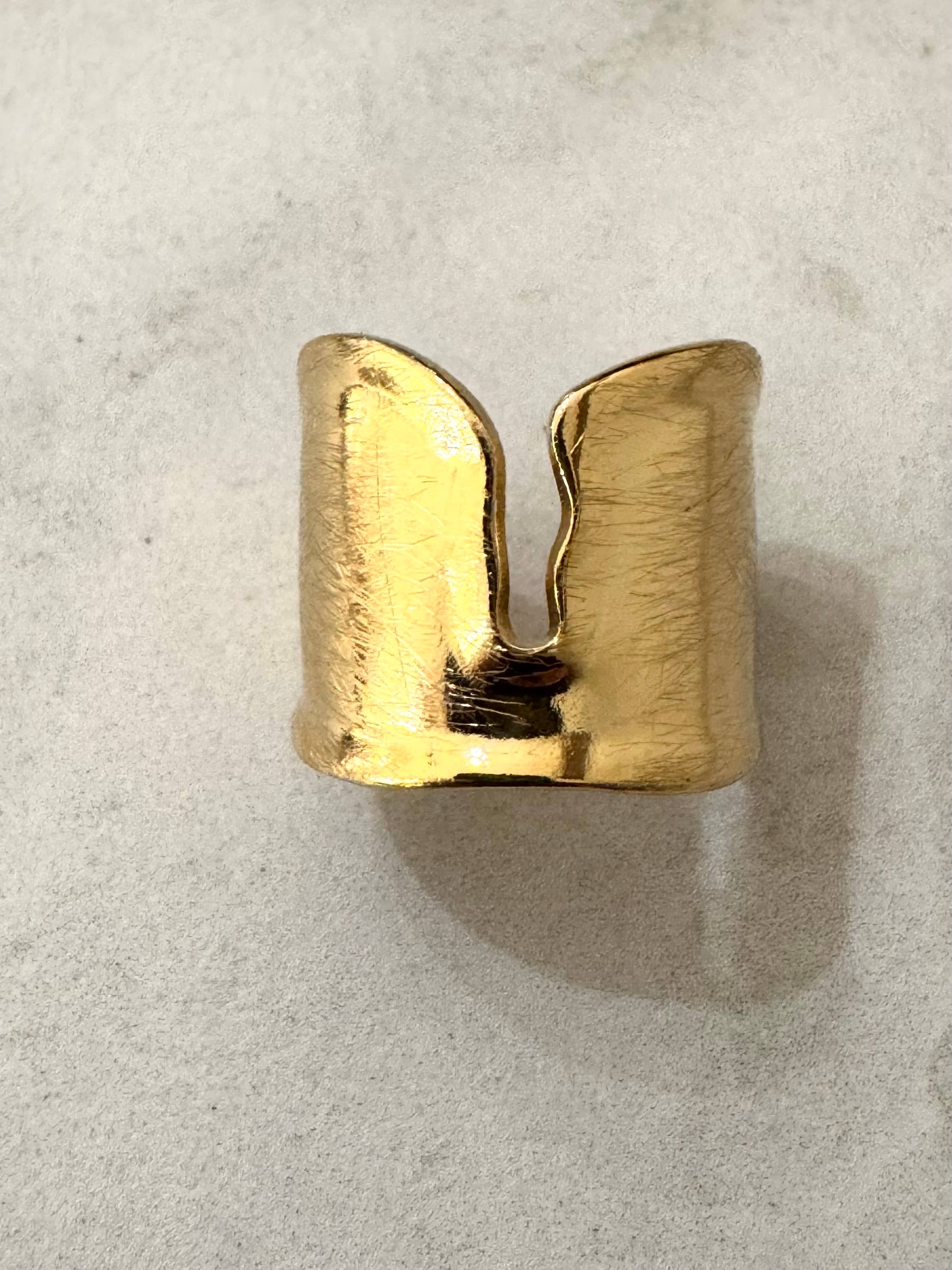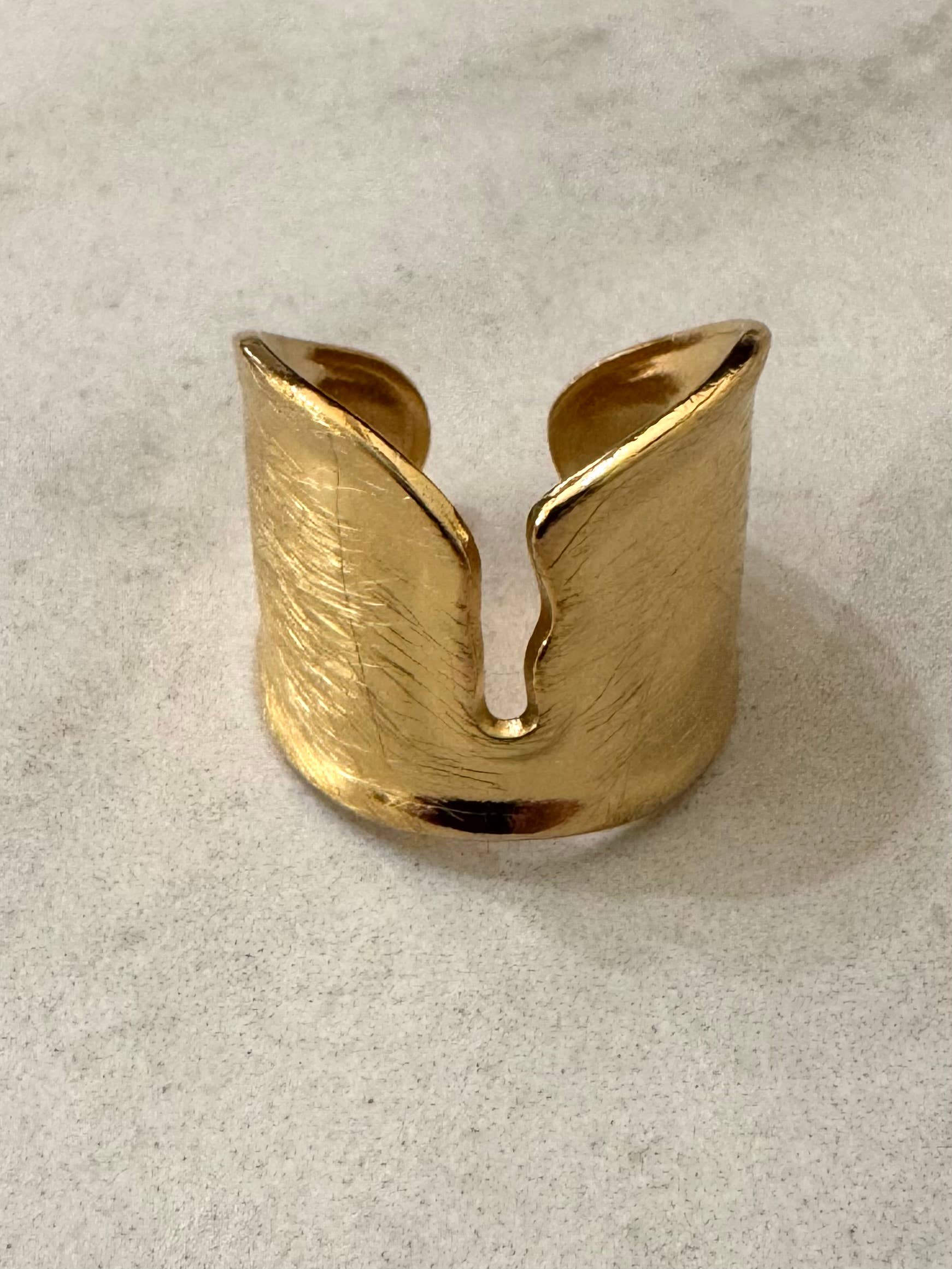 La bague Noguchi est fabriquée en acier inoxydable et recouverte d’un plaquage en or 14 carats. Elle dispose d’une taille réglable pour s’adapter parfaitement à votre doigt.
