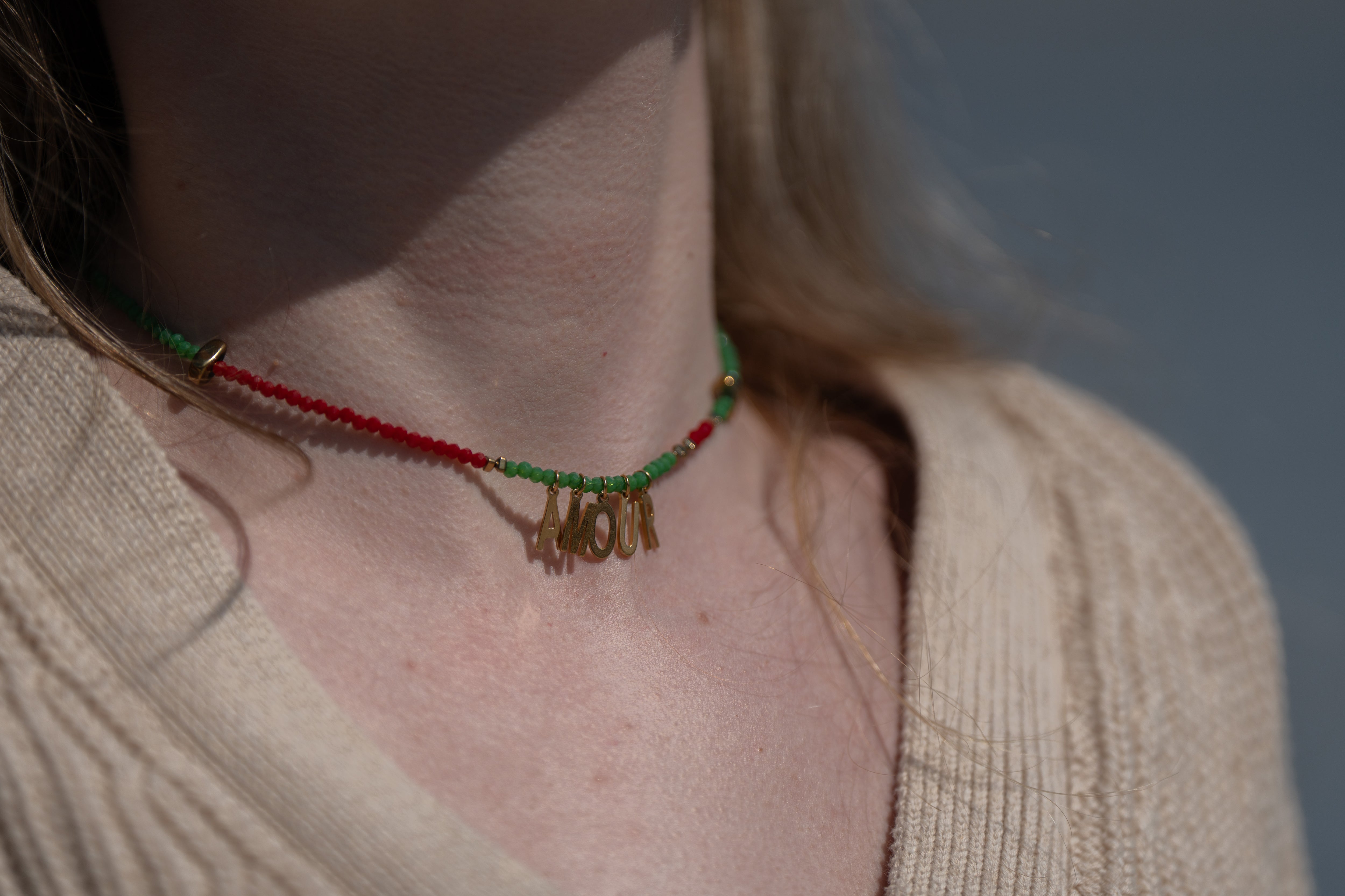Le collier fin aux perles colorées signé LYLYBOY, orné des lettres « AMOUR », célèbre avec délicatesse l’élégance et la gaieté.