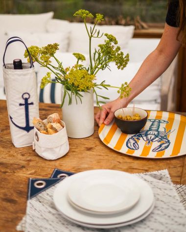 Un plateau rond en bois avec ses rayures jaunes et son homard bleu. Idéal pour un service coloré et une déco ensoleillée inspirée du bord de mer.