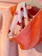 Couleur : éponge de bambou rose et corail + double gaze de coton motifs