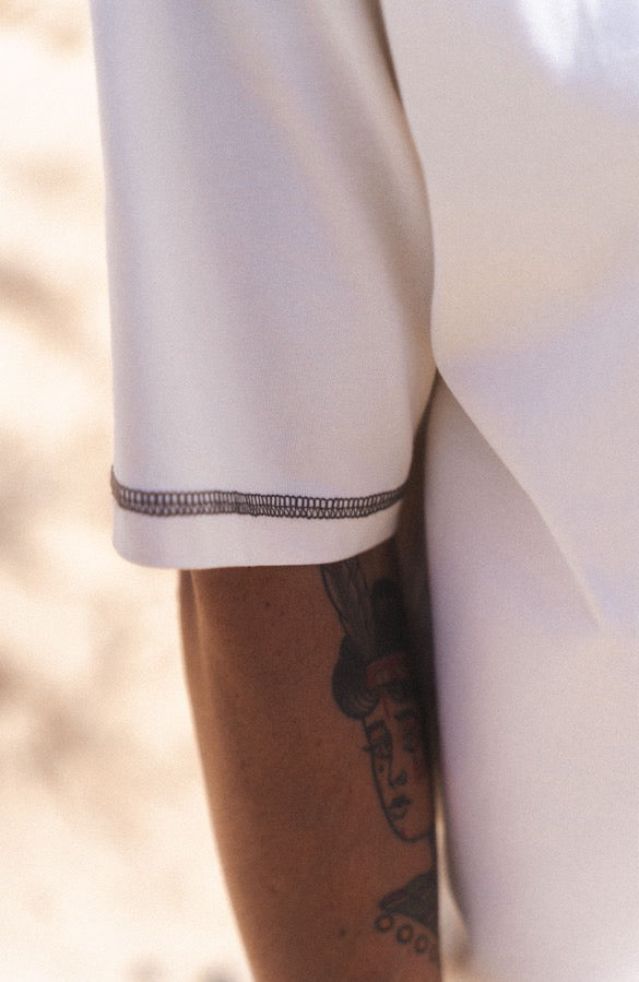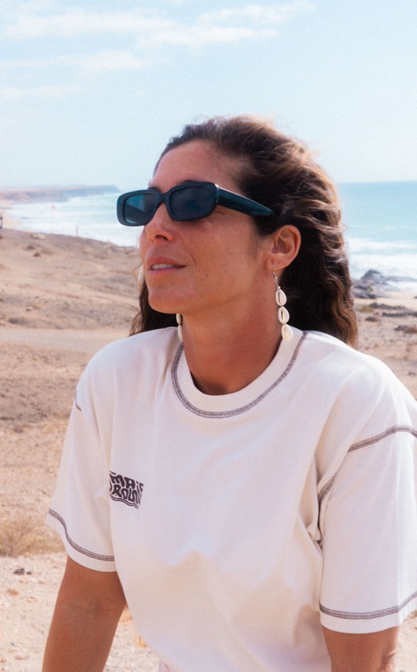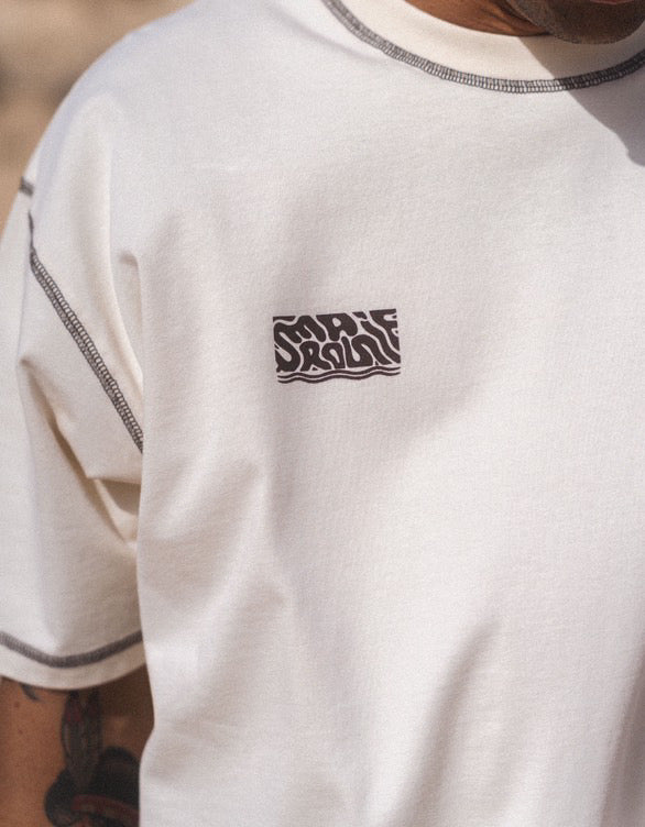 Le T-shirt basique écru UMA est fabriqué et sérigraphié au Portugal. Il est confectionné avec soin chez notre atelier partenaire à 30 minutes de Porto. Il est composé du logo UMA ROSIE sur l'anti-coeur avec des surpiqûres contrastantes marrons.