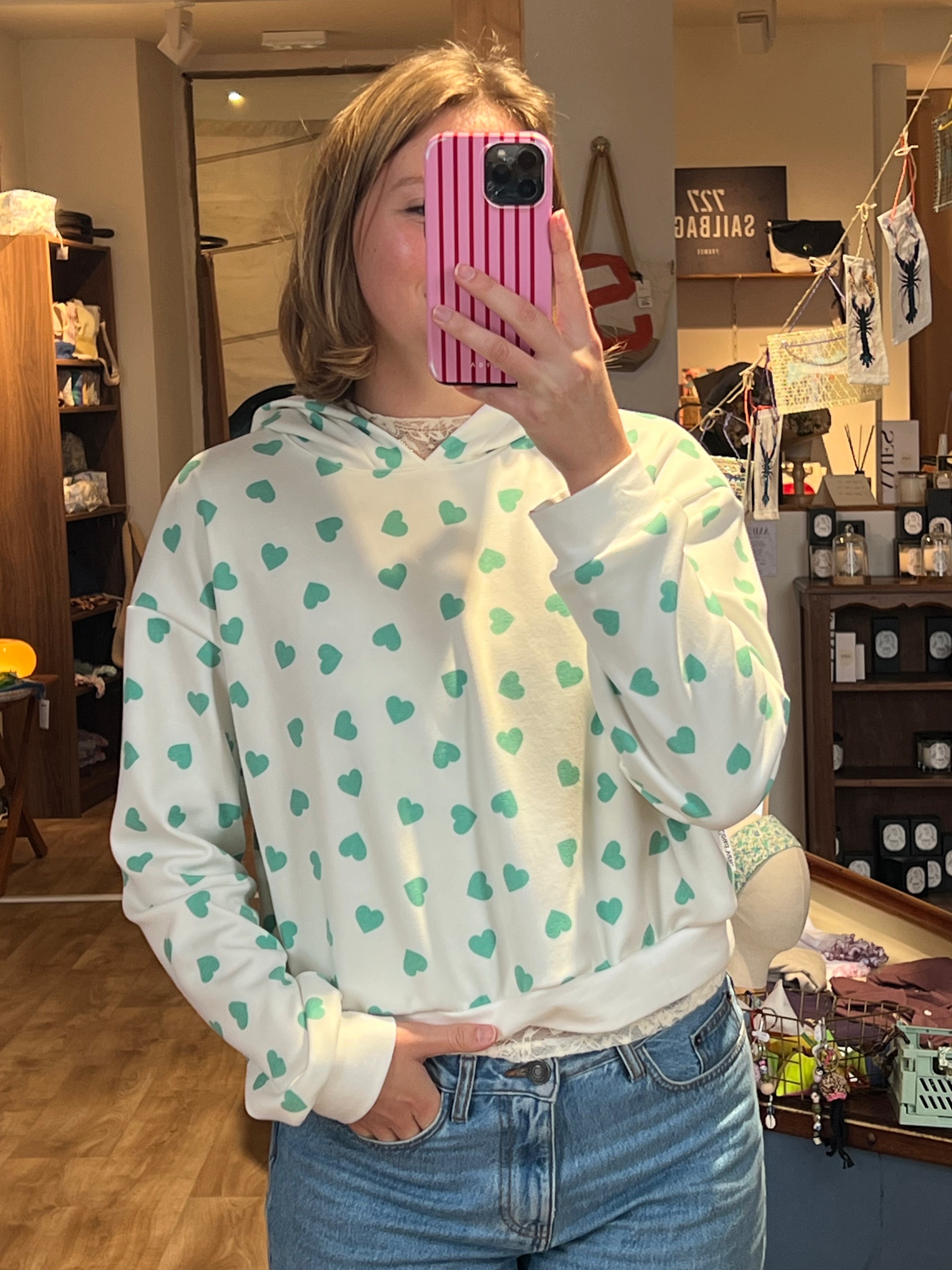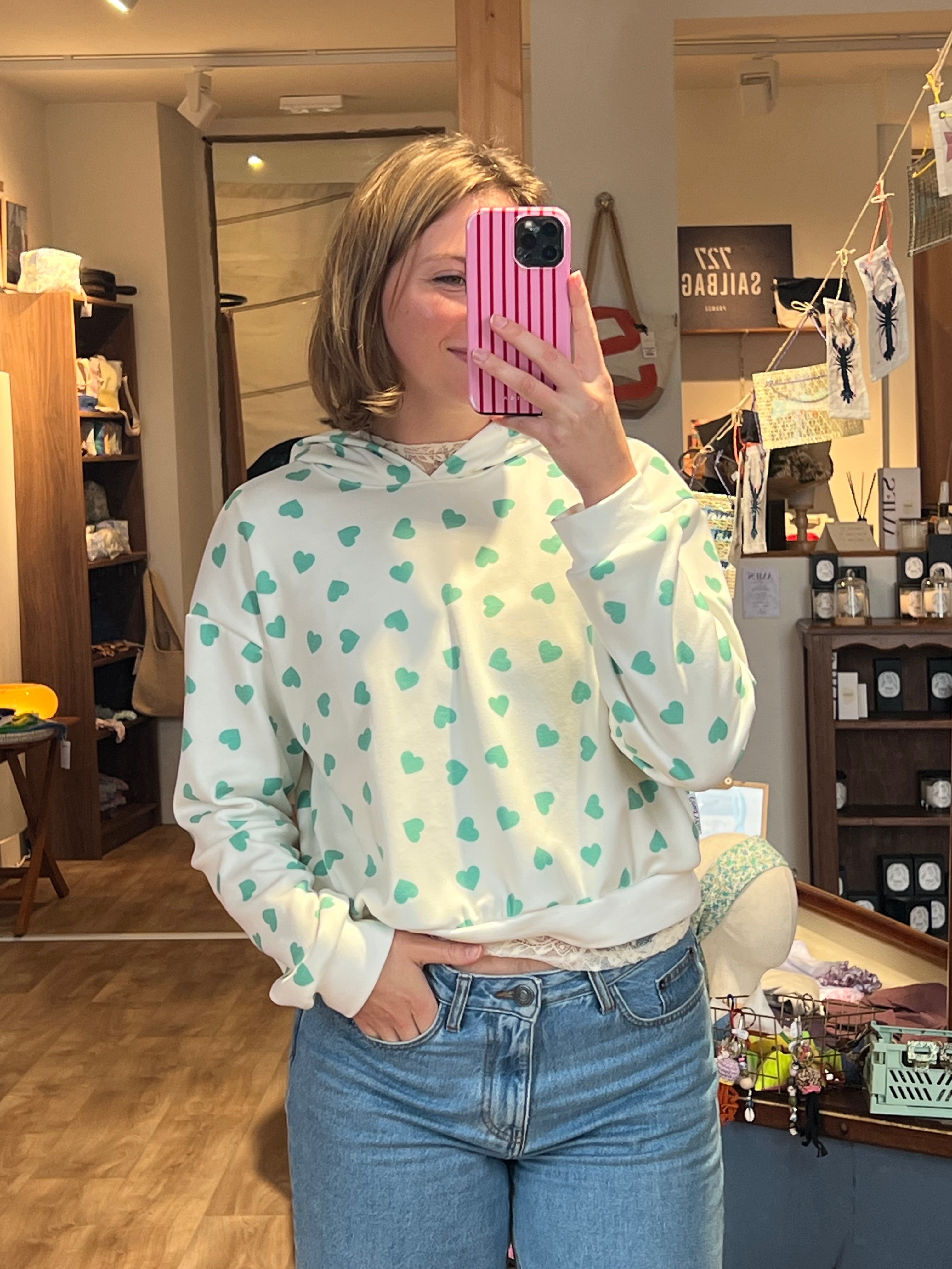 Le sweat à capuche blanc à cœurs signé Coud’vent est confectionné à la main en Bretagne, à Lannilis, dans un tissu en coton et polyester ultra doux.