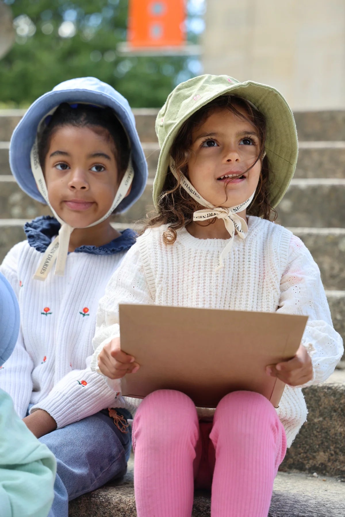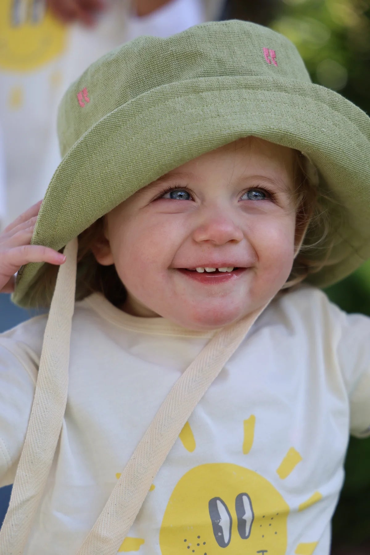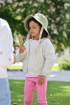 Notre iconique bob, The 90's pour enfant couleur matcha, délicatement brodé de petites apostrophes rose pale. Ce chapeau est parfait pour protéger votre petit du soleil tout en ajoutant une touche de mode à sa tenue.