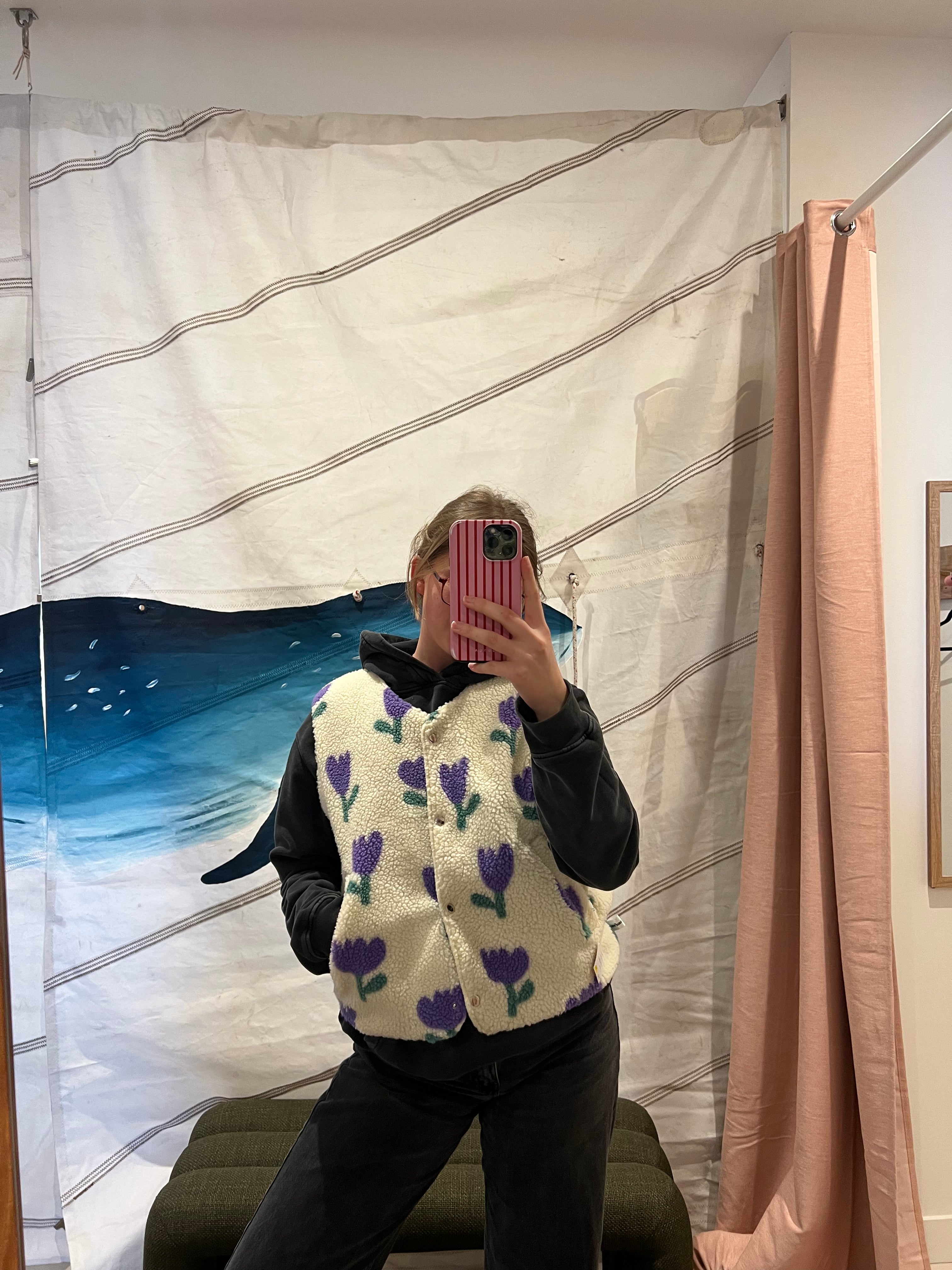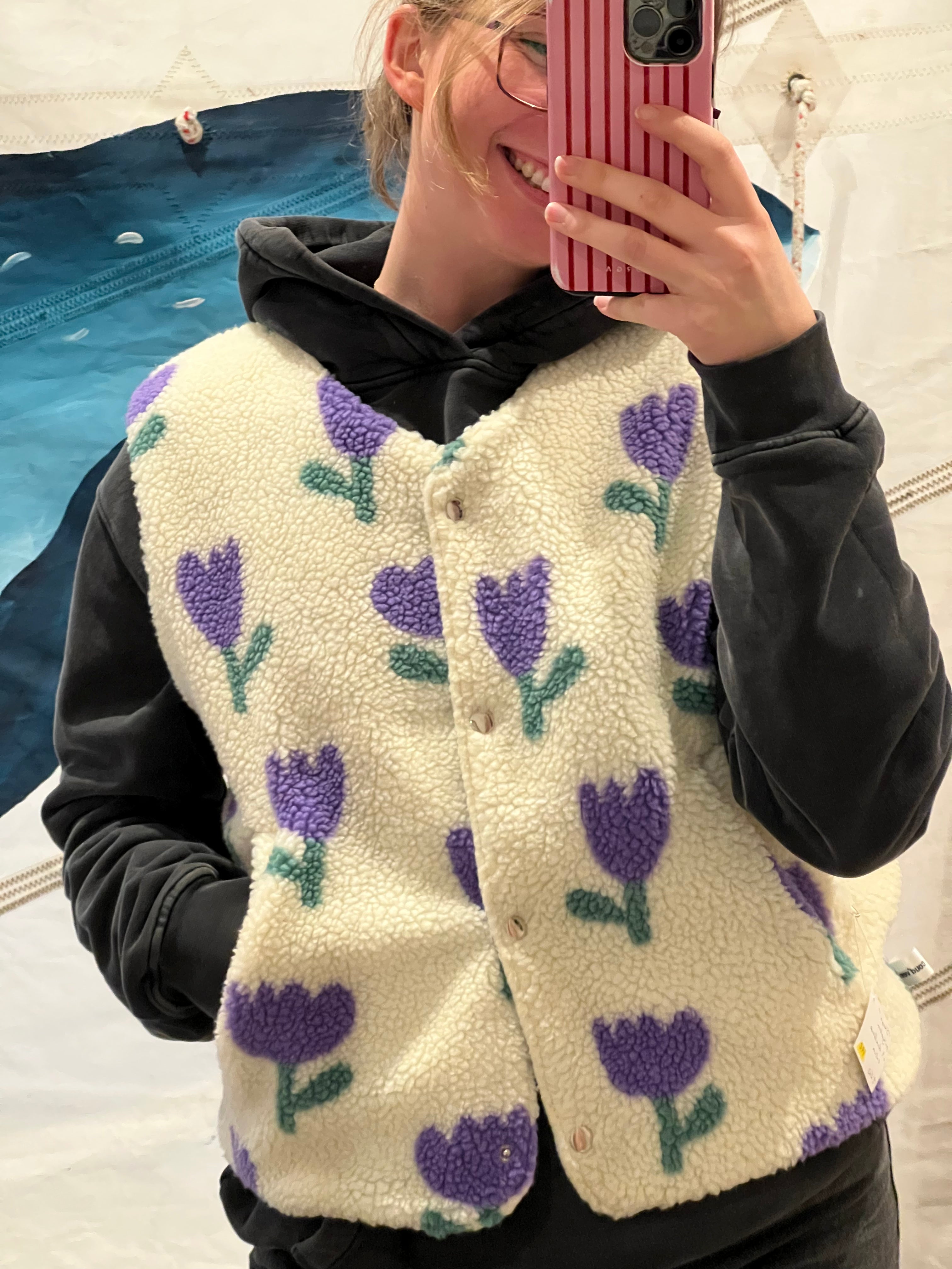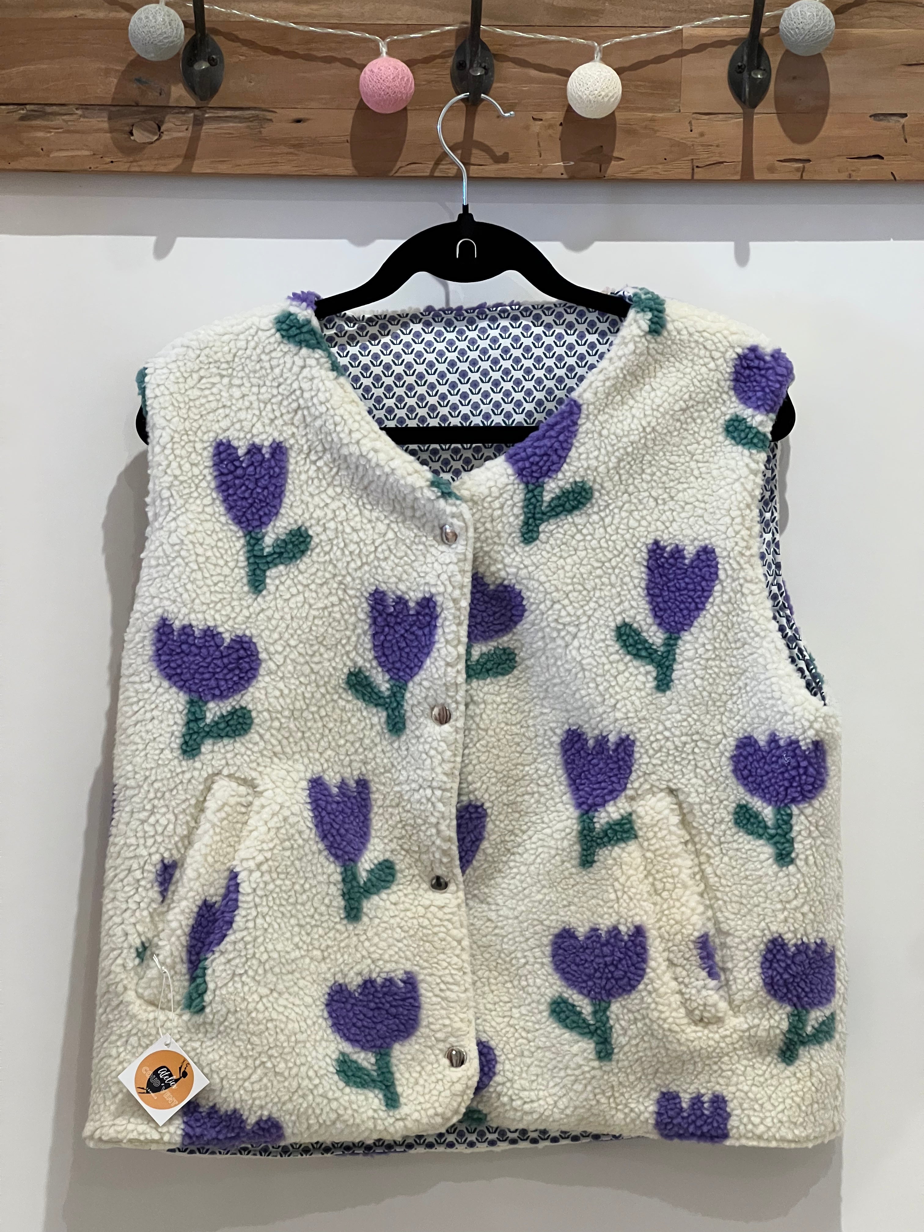 Plongez dans la douceur et le style avec le Gilet Tulipe mauve signé Coud'vent , confectionné à la main à Lannilis, en Bretagne.