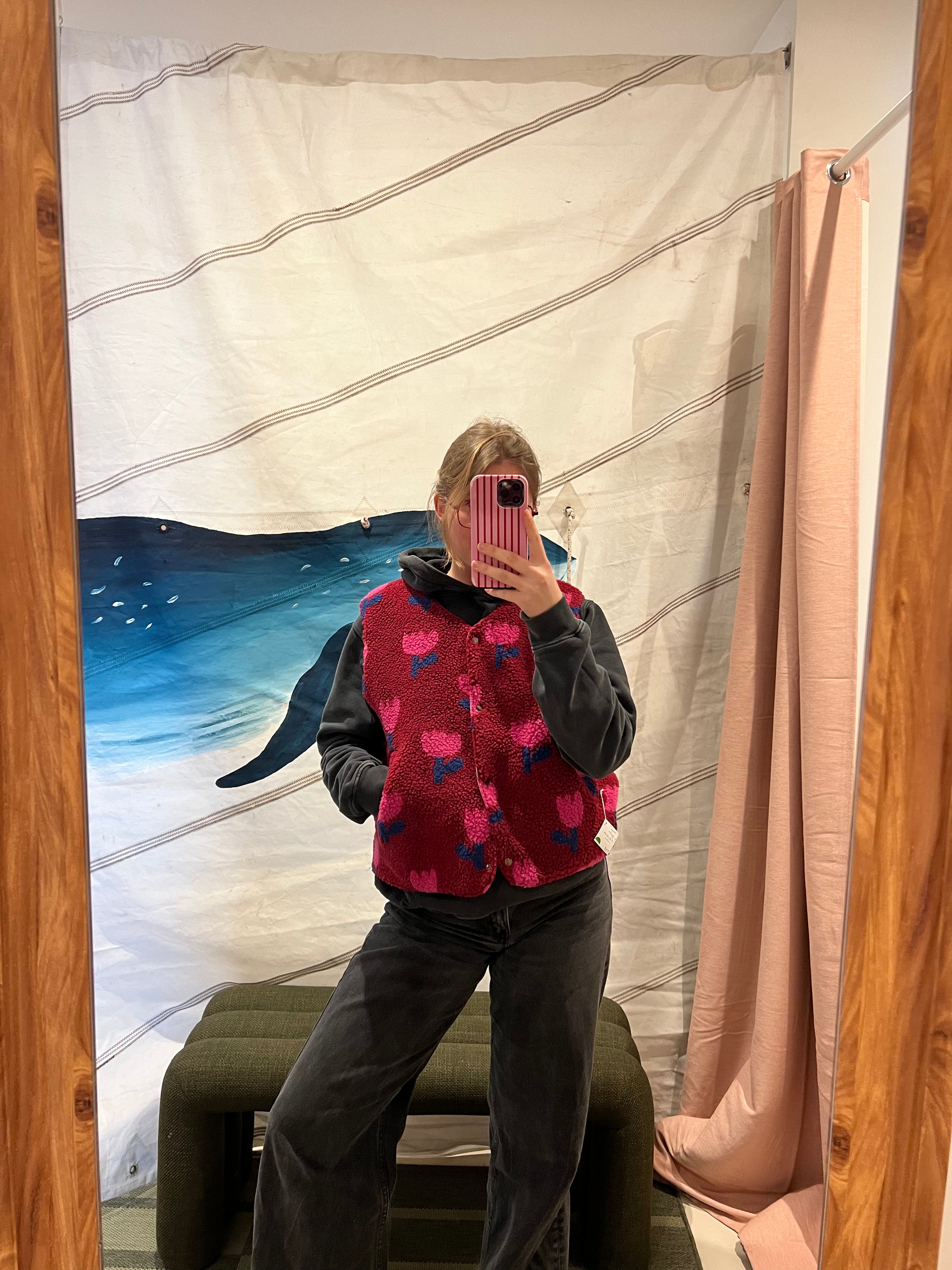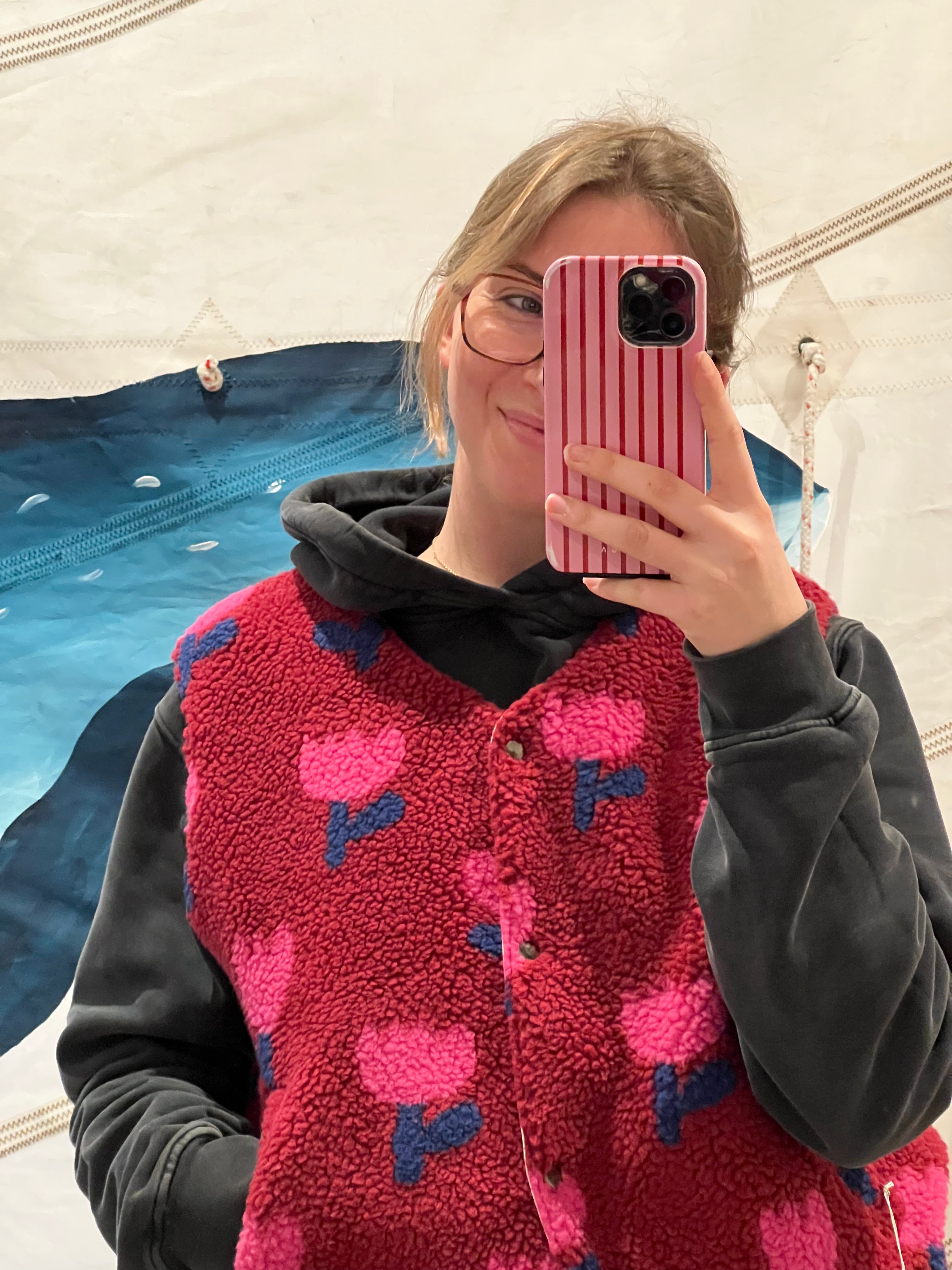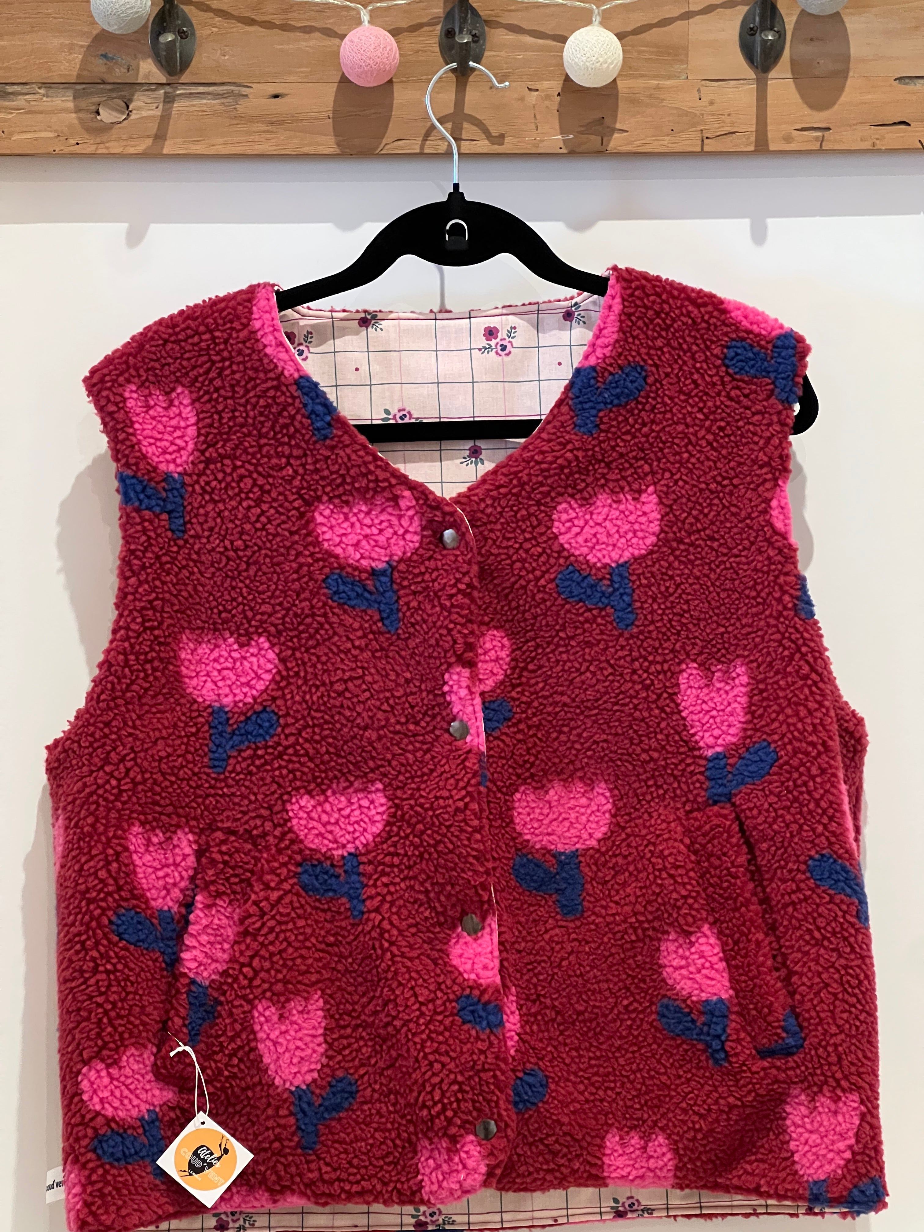 Plongez dans la douceur et le style avec le gilet Tulipe rose signé Coud'vent , confectionné à la main à Lannilis, en Bretagne .
