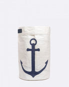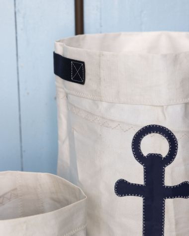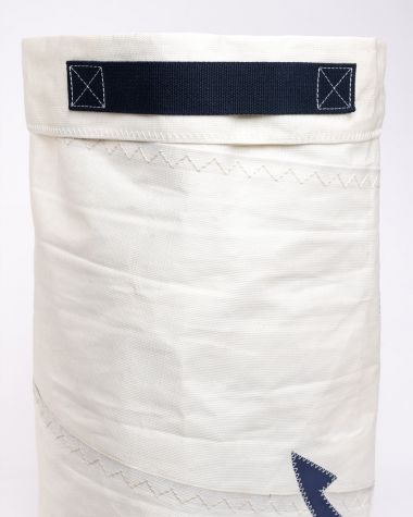 Le panier à linge est réalisé en voile technique blanche 100% recyclée et un avec une ancre marine bleu cousue avec notre iconique point zigzag. Une fiche d'authentification est cousue à l'intérieur et certifie l'origine de la voile.