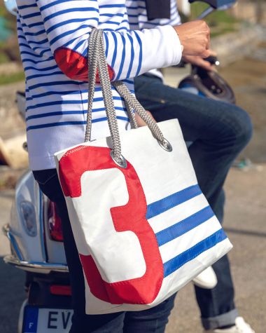 Le Charlie Armor Lux est réalisé à partir de voile de bateau 100% recyclée. Rayures bleues et chiffre rouge s’associent à la voile blanche et révèlent alors, un sac chic et pratique. Une fiche d'authentification cousue à l'intérieur raconte l'histoire de la voile.