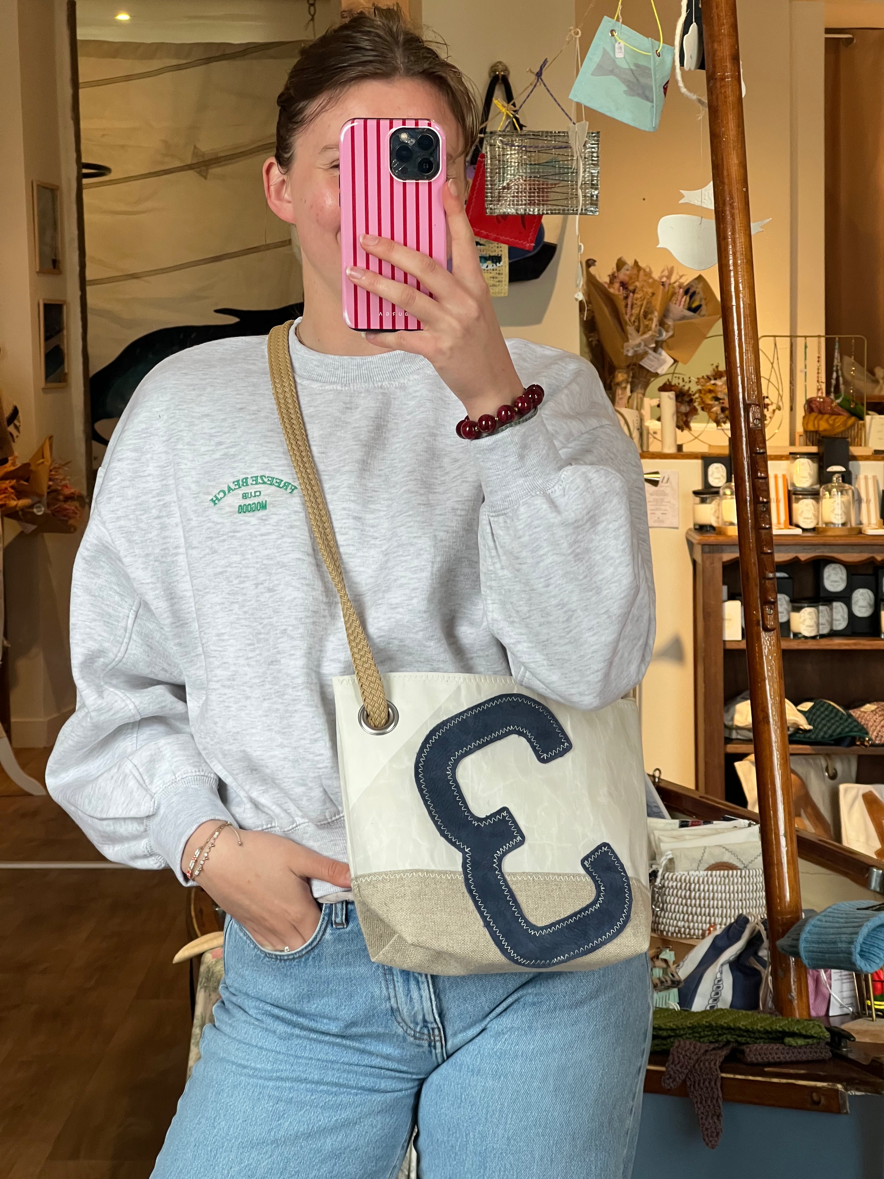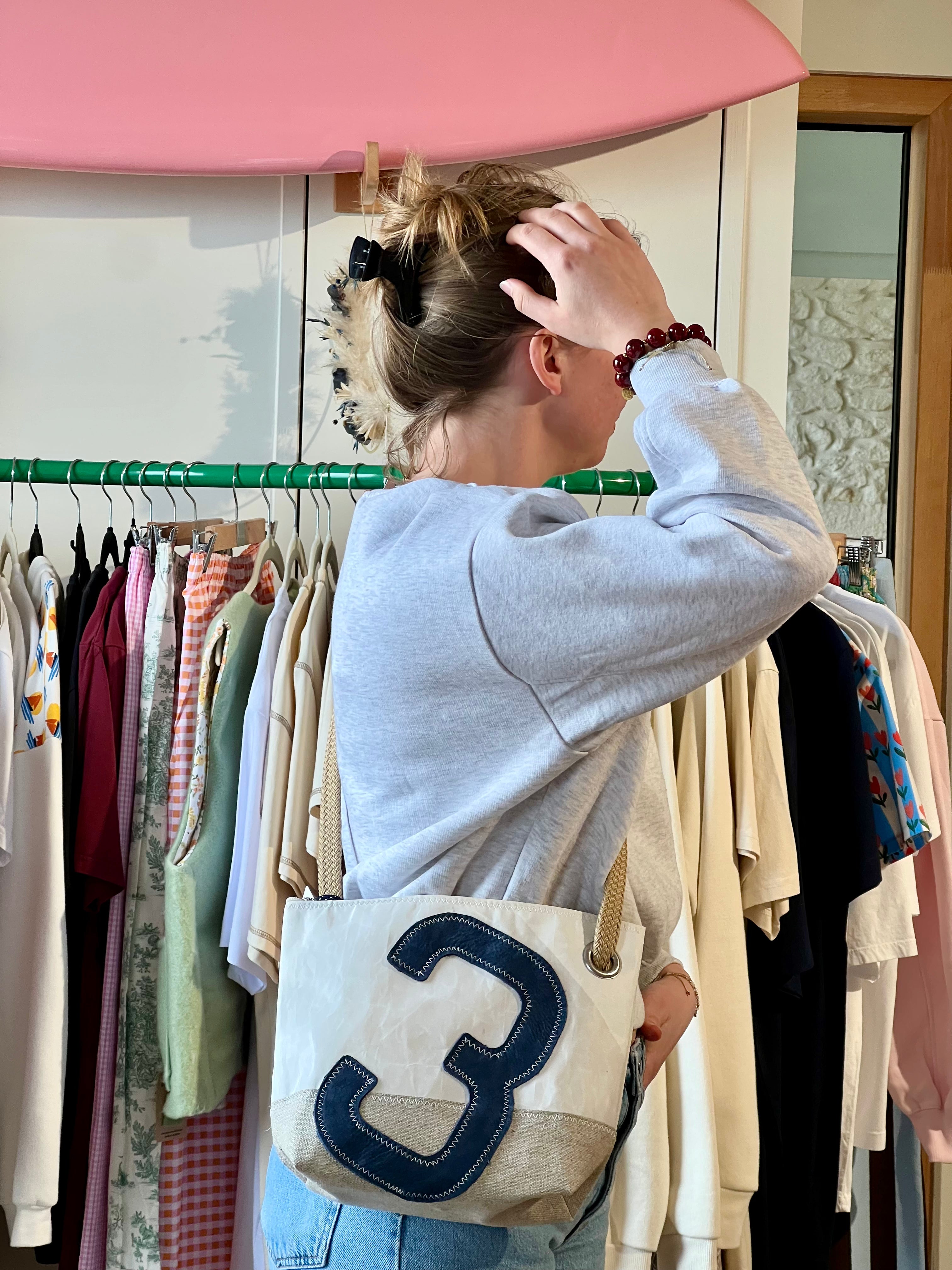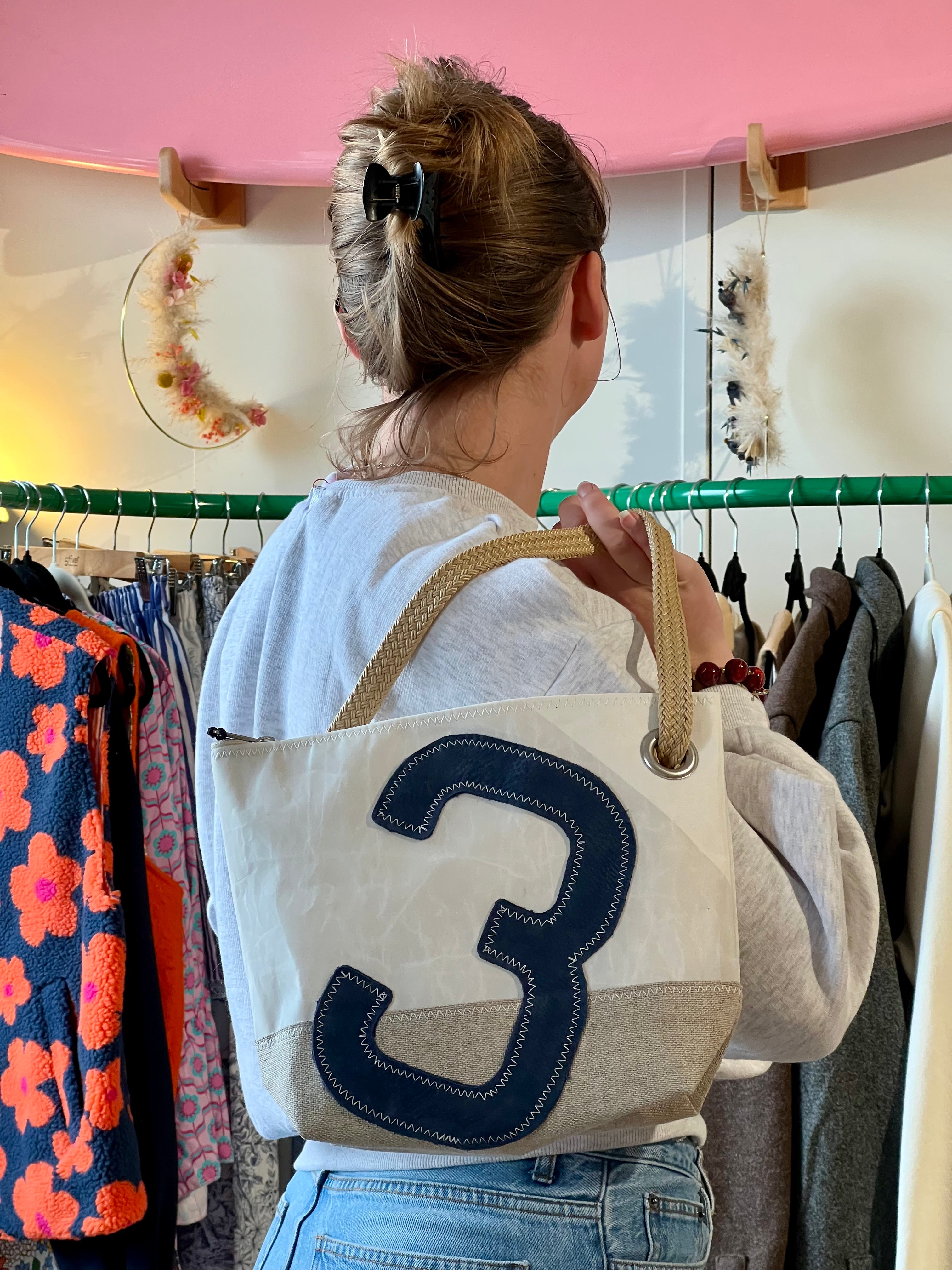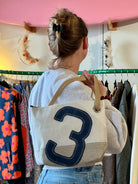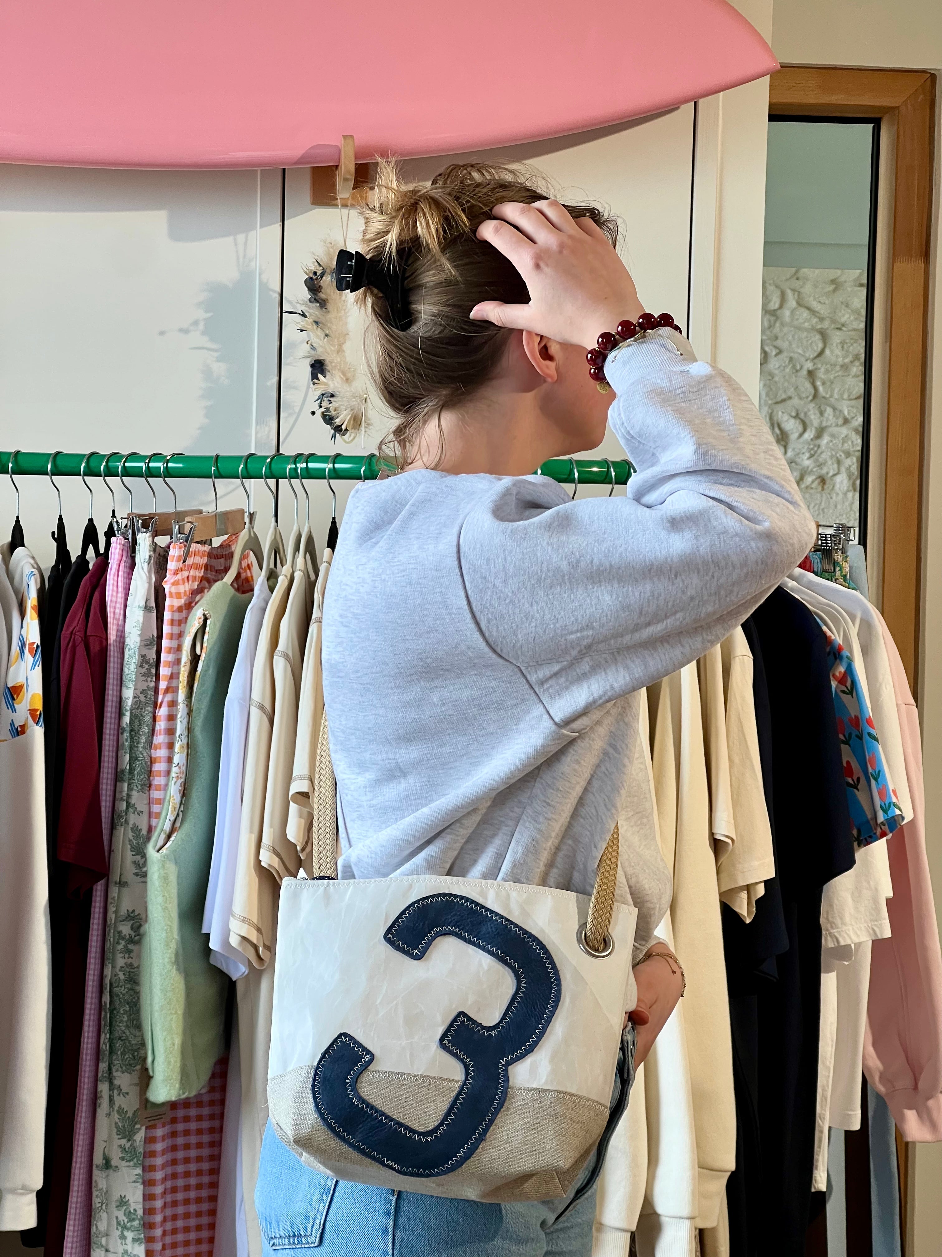 Un numéro 3 en cuir bleu marine est cousu sur ce sac en voile de bateau 100 % recyclée, mis en valeur par notre emblématique point ZigZag. Sa base en lin apporte une touche d’élégance et de naturel.
