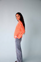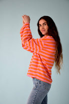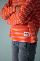T-shirt à manches longues de couleur orange avec des rayures fines en rose poudré et fuchsia.