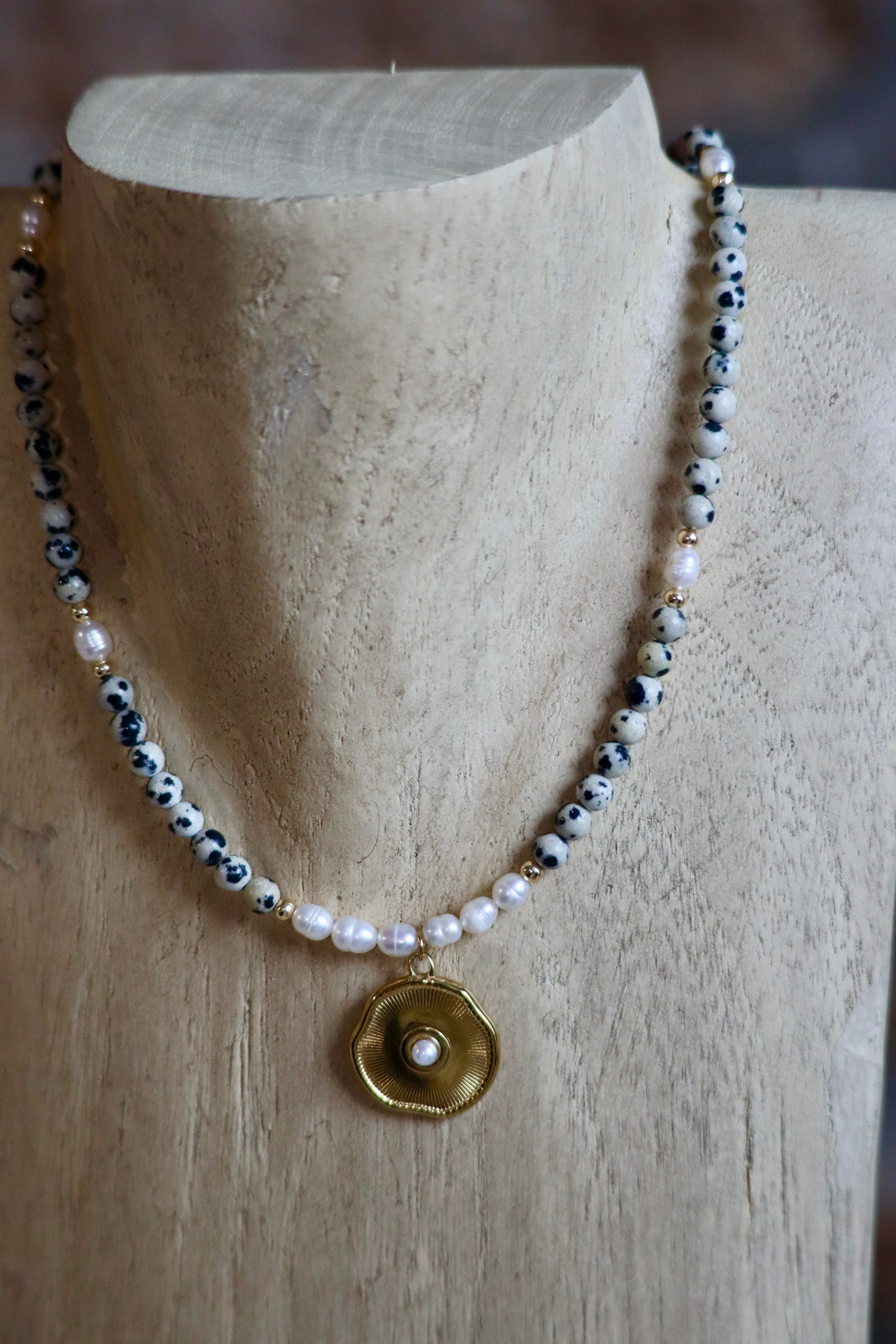 Découvrez le collier Dalma, un ras-de-cou en perles naturelles de jaspe dalmatien, accompagné de perles de culture d’eau douce et d’un pendentif en acier inoxydable avec bille de nacre. Chaque pièce est entièrement fabriquée à la main pour un rendu unique et raffiné.