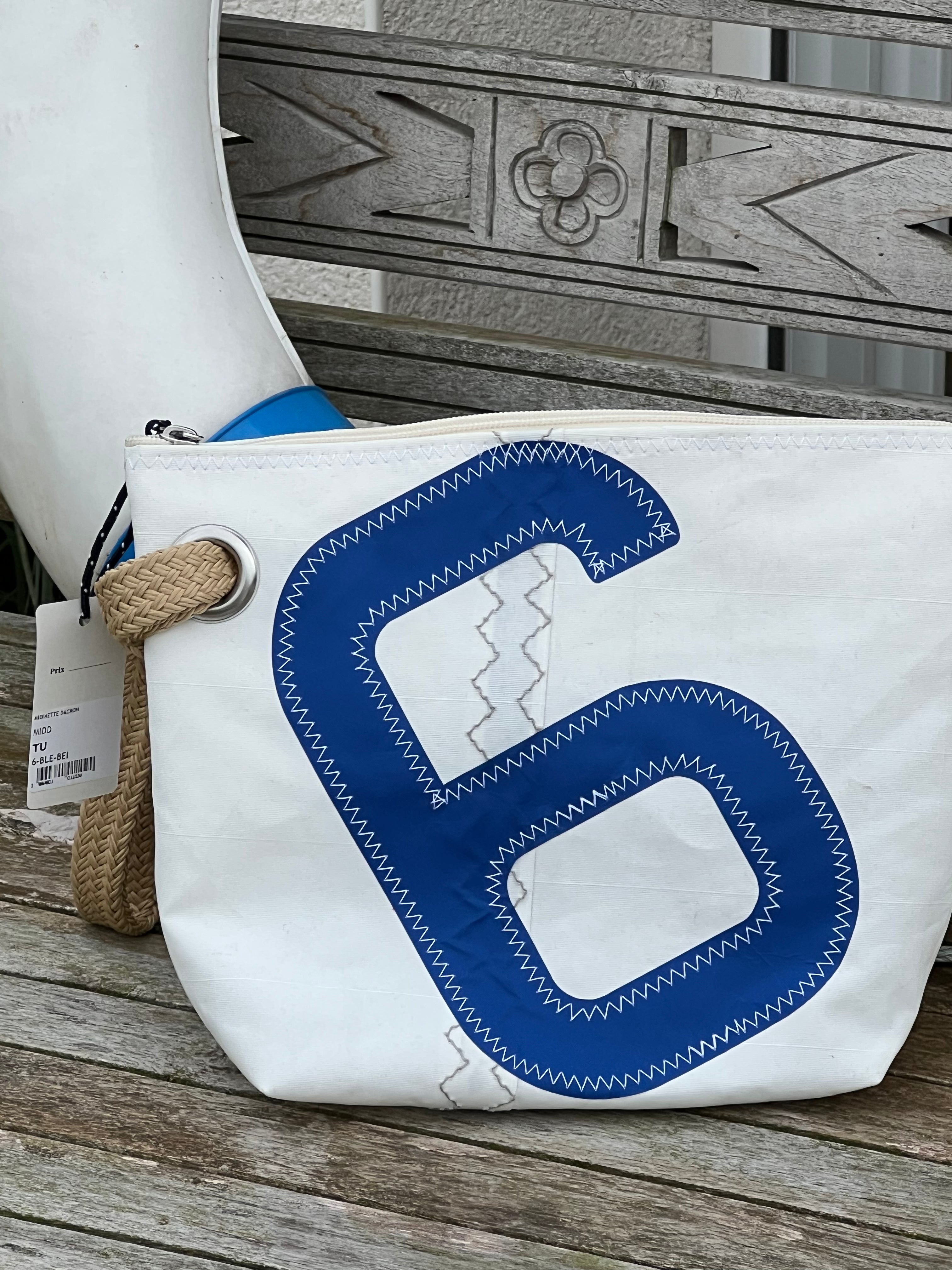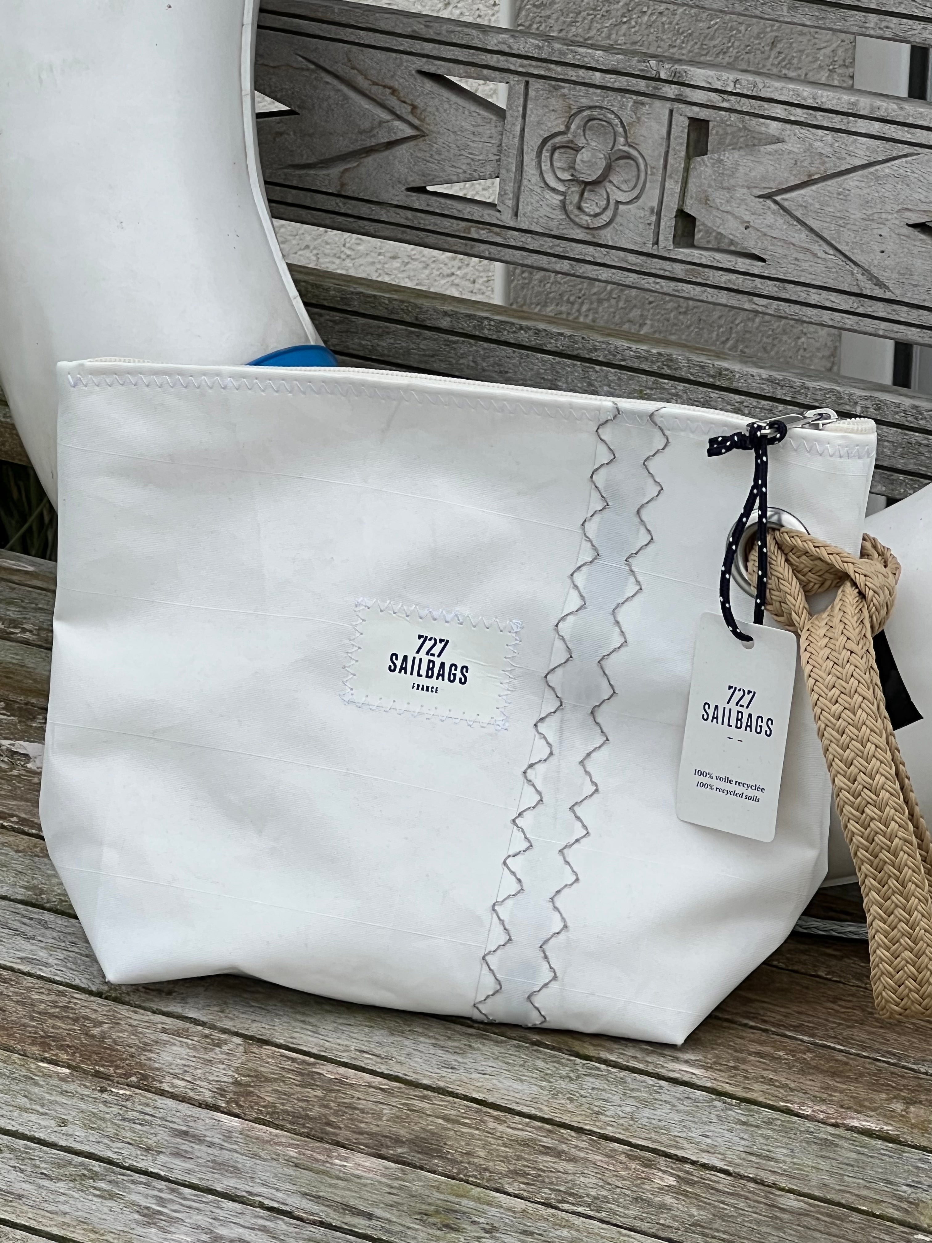 La Midinette est un petit sac qui permet de rassembler les éléments nécessaires à votre journée. Elle se porte à la main. La Midinette est réalisée à partir de voile de bateau 100% recyclée.